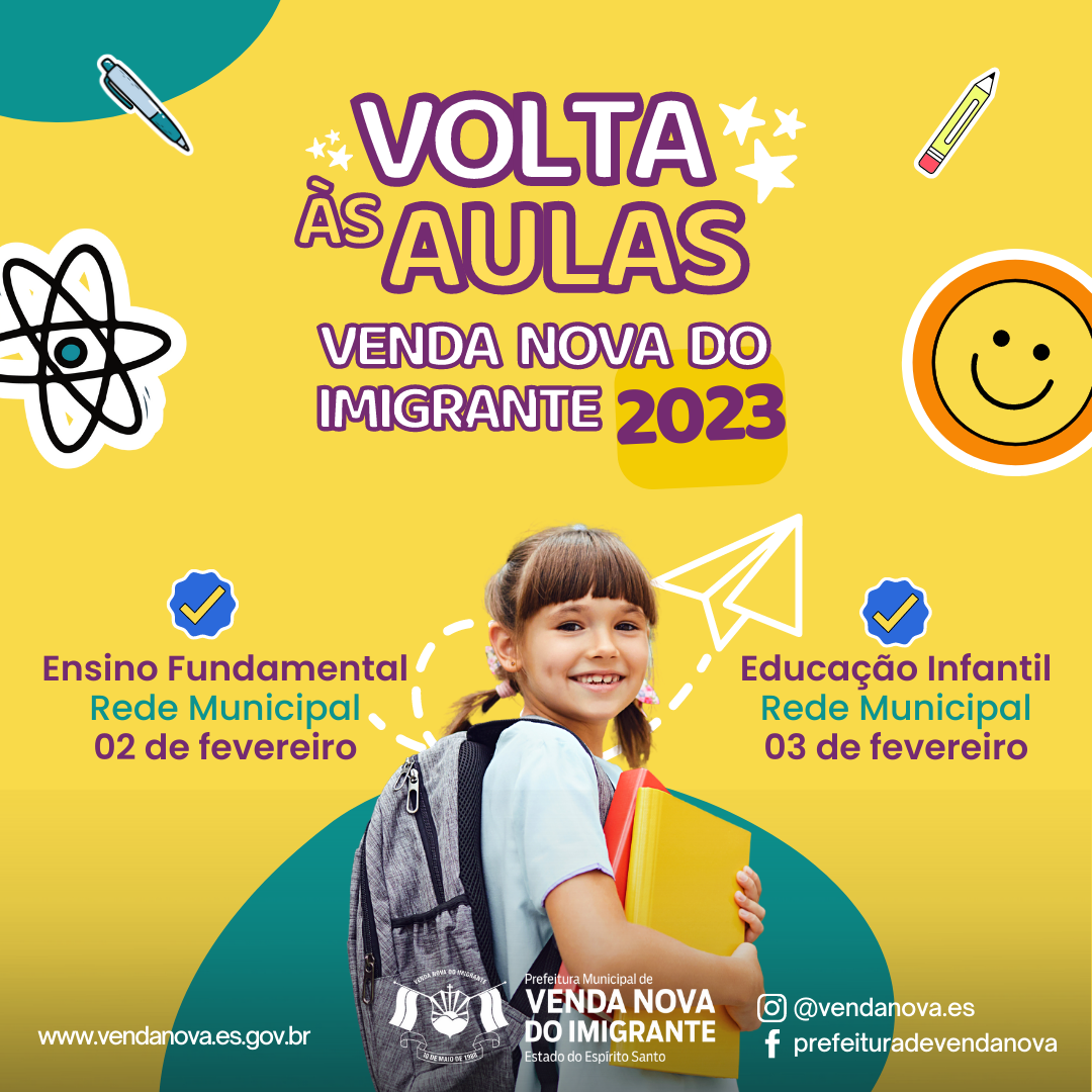 Atenção papai, mamãe, responsável e estudantes da rede municipal de ensino! A Prefeitura de Venda Nova do Imigrante iniciará o ano letivo de 2023 da rede pública municipal de ensino na primeira semana de fevereiro. A Secretaria Municipal de Educação, junto com as equipes escolares, organizaram o retorno para garantir um proveitoso ano letivo que se inicia para mais de 2 mil estudantes do Município.