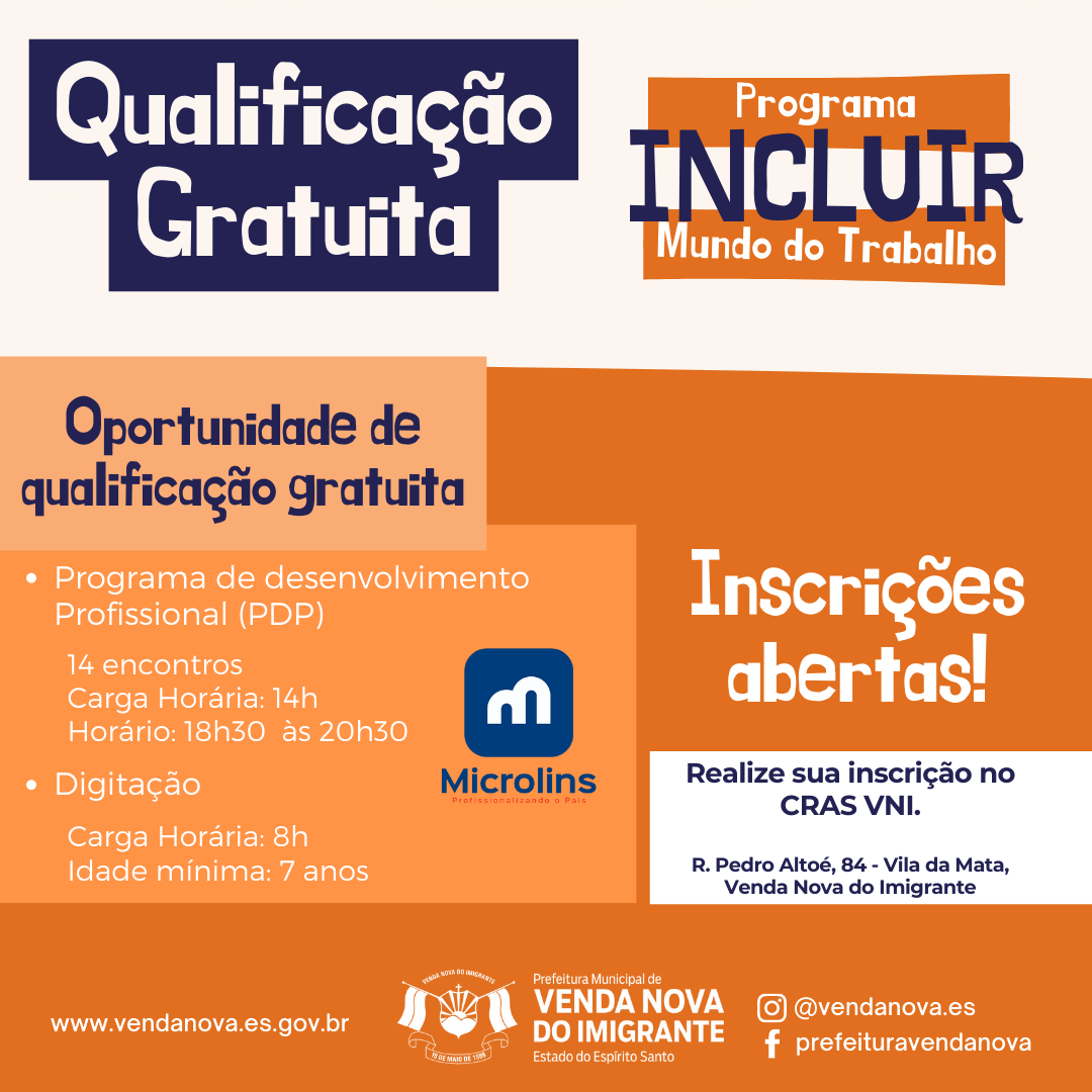 A Prefeitura de Venda Nova do Imigrante, através da Secretaria Municipal de Assistência Social, por meio do Programa Incluir – Mundo do Trabalho, em parceria com a Microlins de Venda Nova do Imigrante está com inscrições gratuitas para qualificação no Munícipio. Os cursos ofertados são: Programa de Desenvolvimento Profissional e Digitação. As inscrições estão abertas e podem ser realizadas no CRAS de Venda Nova.
