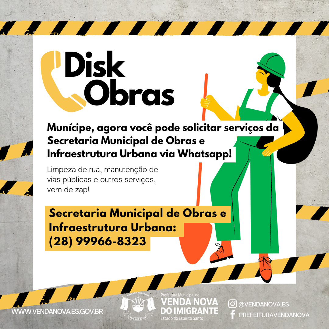 Atenção, munícipe! A Prefeitura de Venda Nova do Imigrante quer ouvir você, sobre qual benfeitoria é necessária no seu bairro. Para isso, a Secretaria Municipal de Obras e Infraestrutura Urbana lançou nesta terça-feira (14), o “Disk Obras”, um serviço de atendimento via ligação telefônica ou whatsapp, que busca atender o munícipe de forma mais rápida.