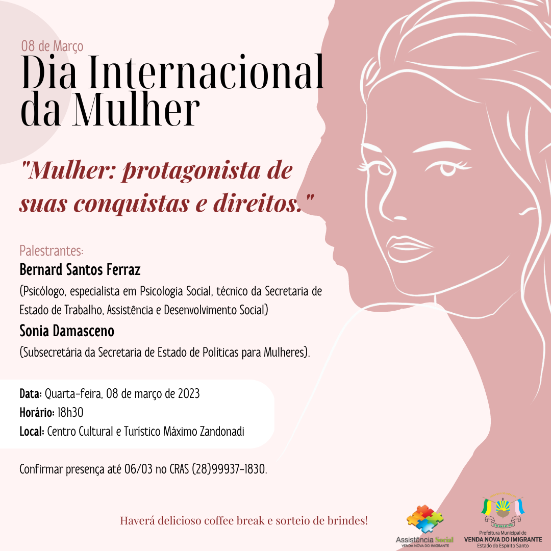 Em celebração do Dia Internacional da Mulher, a Prefeitura de Venda Nova do Imigrante através da Secretaria de Assistência Social, realizará o evento “Mulher: Protagonista de suas Conquistas e Direitos.” A entrada gratuita.