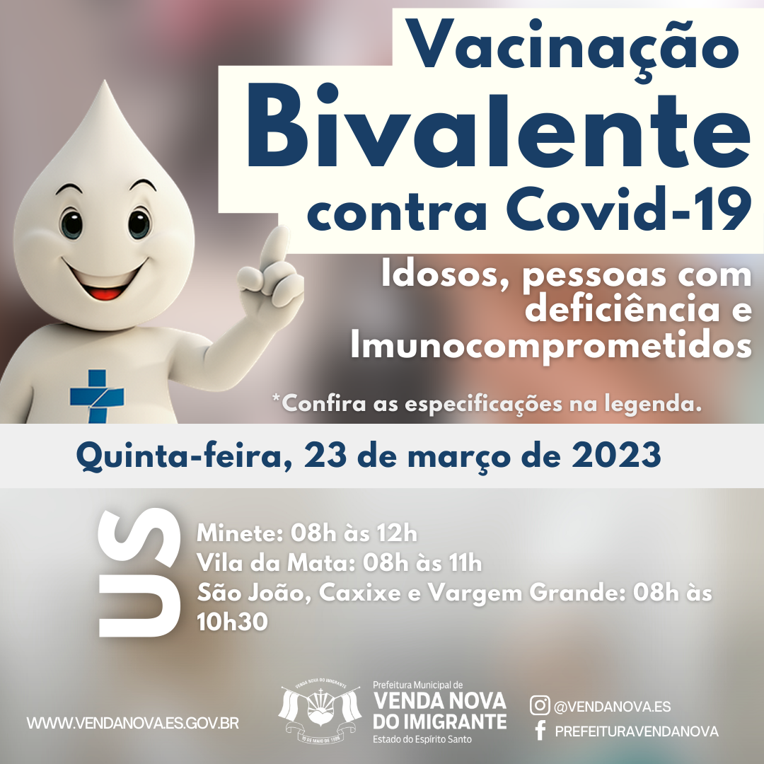 Na quinta-feira (23), a vacina bivalente será aplicada em idosos com mais de 60 anos, pessoas com deficiência e imunocomprometidos. Além da vacina bivalente, haverá a vacinação para população geral (bebês, crianças e adultos) em todas as Unidades de Saúde.