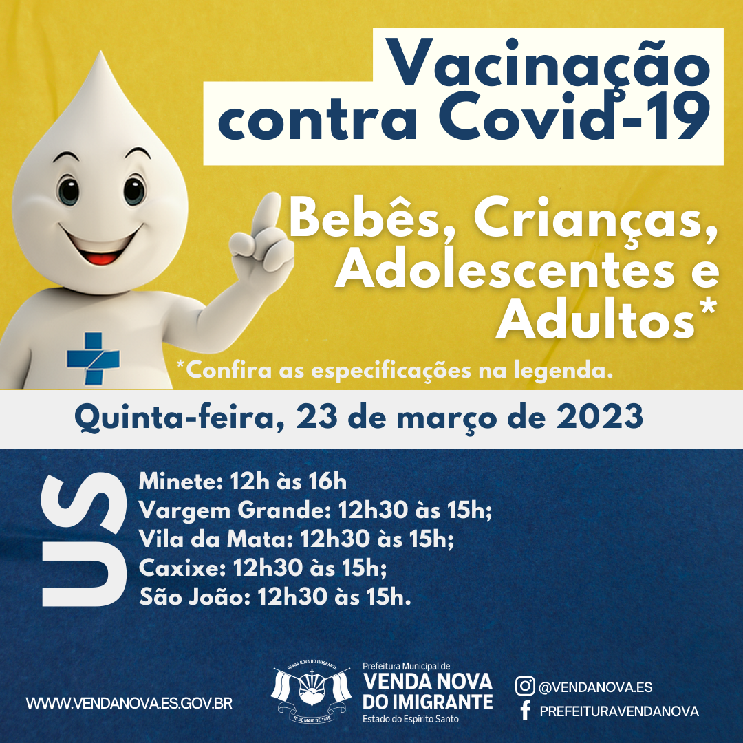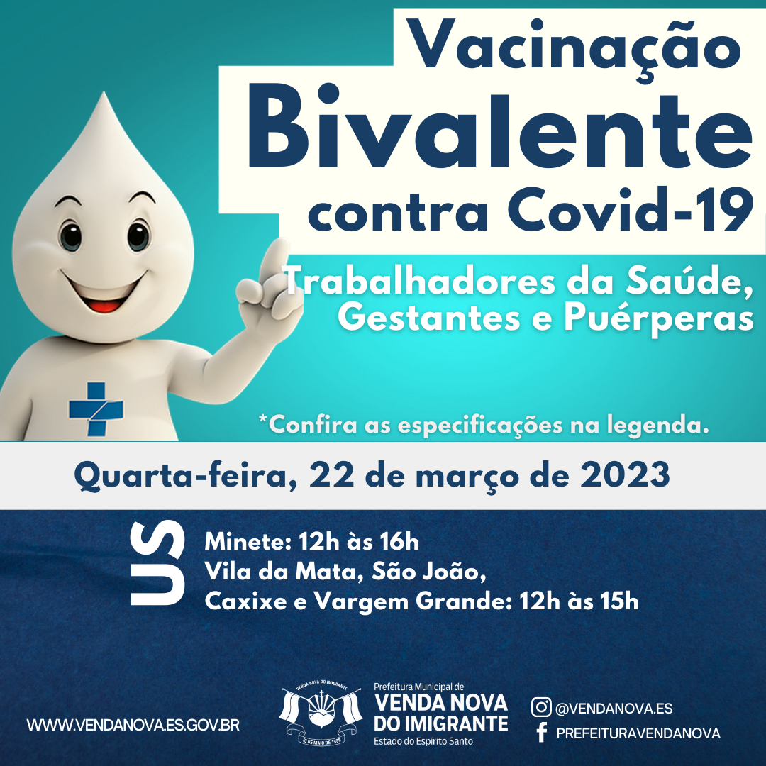 A Prefeitura de Venda Nova do Imigrante, através da Secretaria Municipal de Saúde, continua a vacinação da população contra covid-19 no Município. Nesta quarta (22) serão vacinados com a vacina bivalente contra a covid-19, as gestantes, puérperas e os trabalhadores da área da Saúde de Venda Nova.