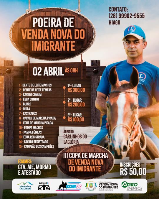 Já no domingo (02), os criadores de equinos e muares poderão participar da “Poeira de Venda Nova do Imigrante”. Trata-se de uma competição não oficial, um tipo de “pelada” que agita o ano hípico, que vai premiar em dinheiro os três primeiros colocados: R$ 300,00 (campeão), R$ 200 (vice) e R$ 100 (3º lugar).