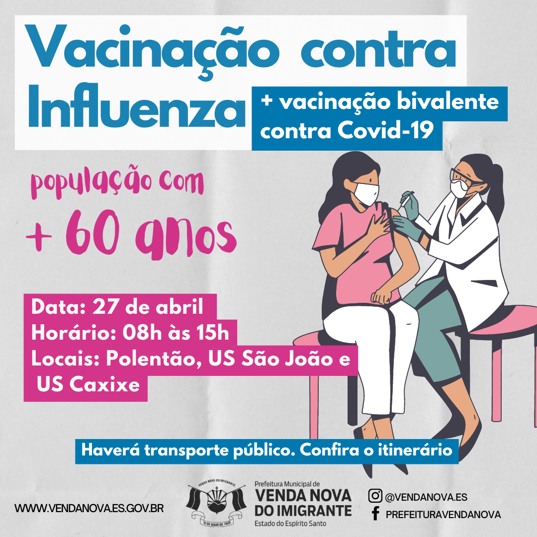 A Prefeitura de Venda Nova do Imigrante, através da Secretaria Municipal de Saúde, intensifica a imunização dos munícipes. Na próxima quinta-feira (27), a Secretaria realizará o dia D de vacinação contra o vírus influenza e covid-19 para idosos com mais de 60 anos residentes no Município.