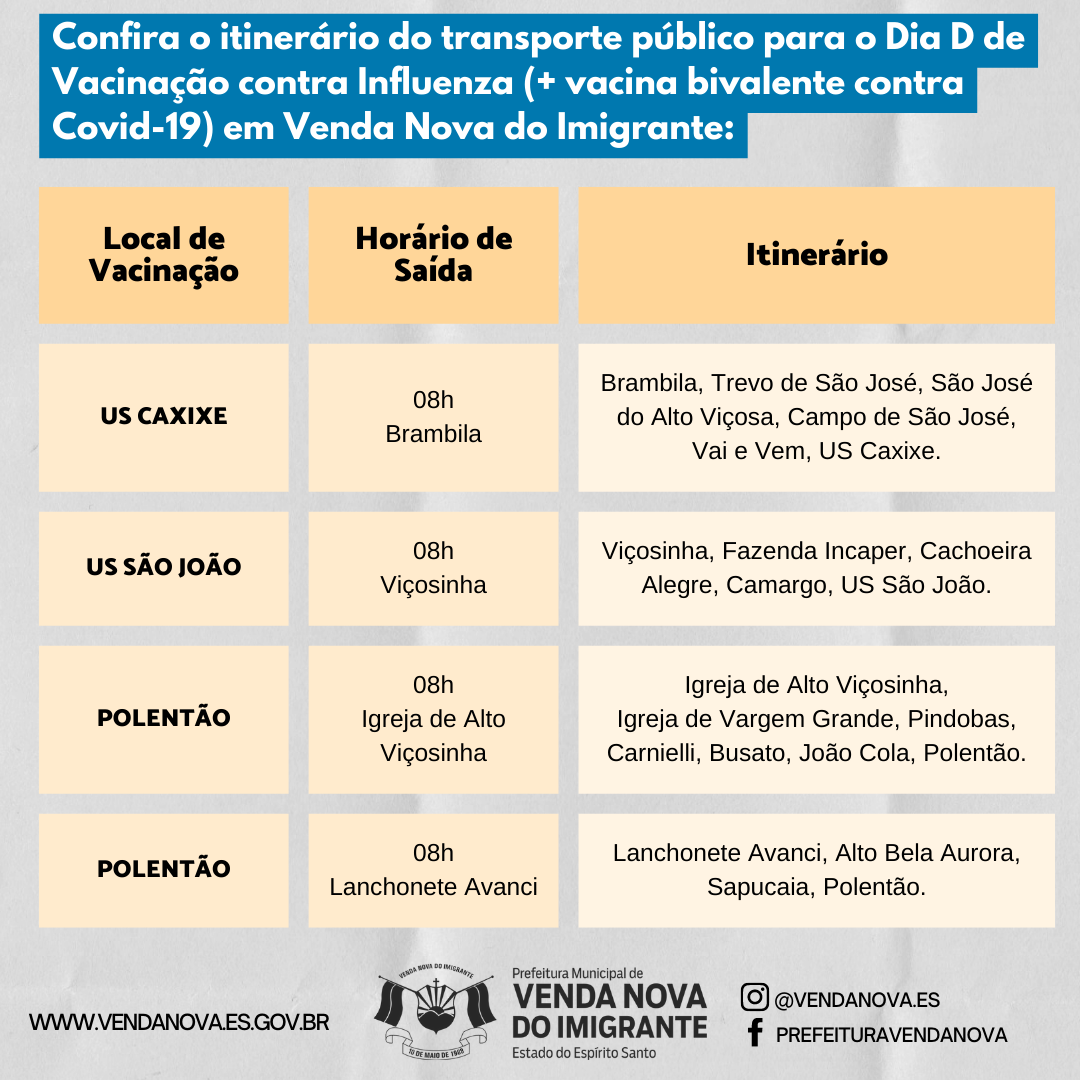 A ação acontecerá no Centro de Eventos Padre Cleto Caliman, o Polentão, e nas Unidades de Saúde de São João e Caxixe. A Prefeitura Municipal disponibilizará transporte gratuito para transporte do grupo prioritário. Confira abaixo o itinerário do transporte: