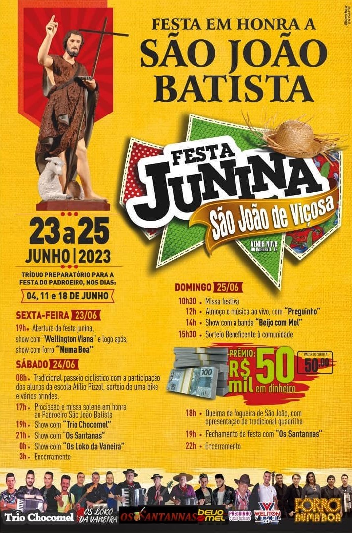 Uma das festas mais tradicionais de Venda Nova do Imigrante, ocorrerá neste final de semana. A festa em honra a São João Batista – Festa Junina realizada pela comunidade de São João de Viçosa, acontecerá de sexta (23) a domingo (25) de junho para aquecer munícipes e turistas do friozinho. Dentro da programação da festa haverá o sorteio beneficente de R$50 mil reais para a comunidade (as cartelas estão no valor de R$50 reais e podem ser adquiridas em diversos pontos de vendas em todo o Município) a queima da fogueira de São João, passeio ciclístico, leilão e diversos shows. Confira a programação completa: