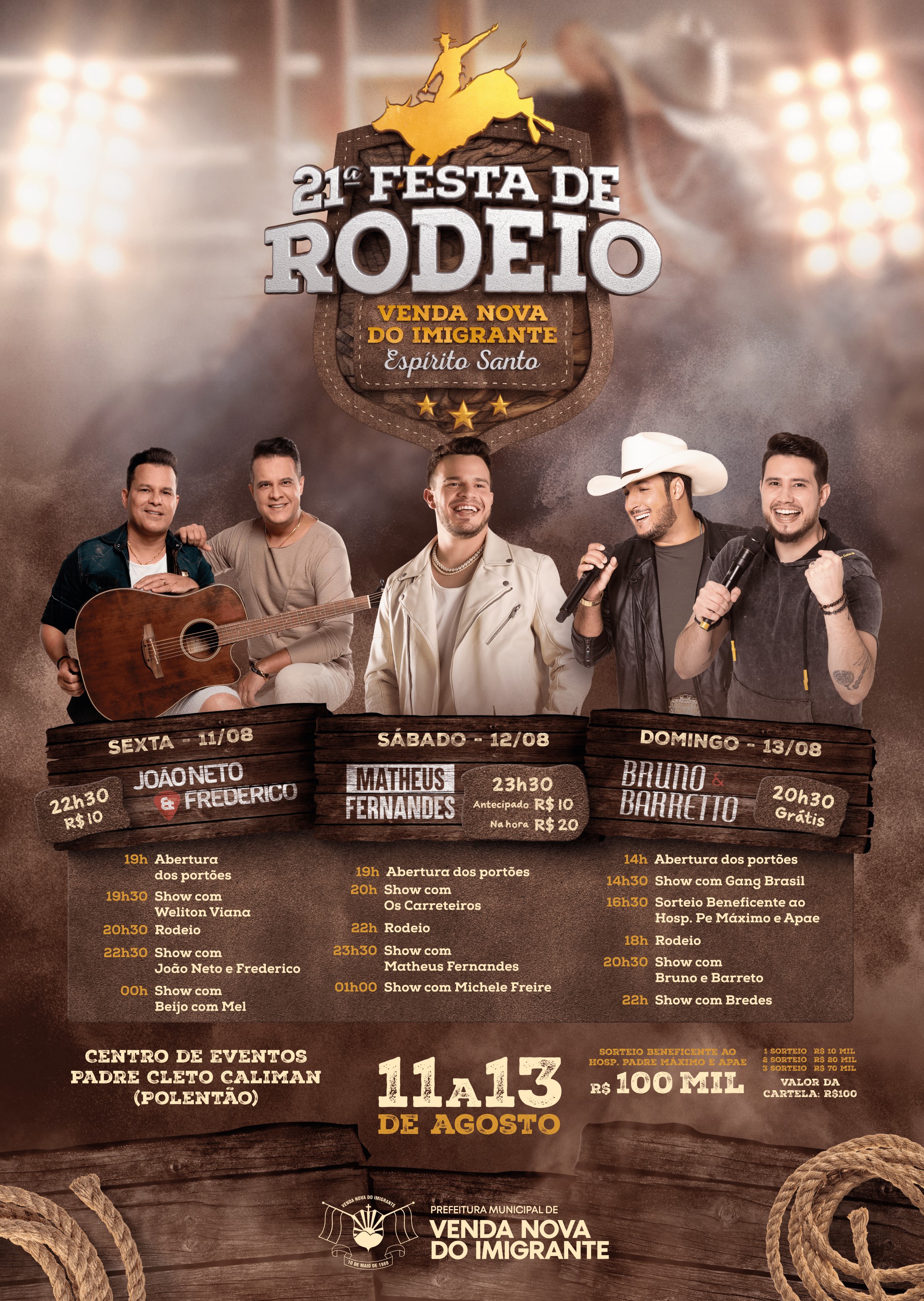 A festa do povo! A Prefeitura de Venda Nova do Imigrante divulga a programação completa da 21ª Festa de Rodeio de Venda Nova do Imigrante, que acontecerá entre os dias 11 e 13 de agosto, no Centro de Eventos Padre Cleto Caliman, o "Polentão".  Com preços de ingressos acessíveis, os três dias de Festa serão repletos de animação, com shows nacionais, regionais e emocionantes competições de rodeio profissional.