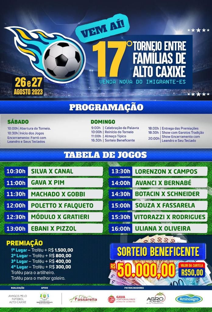 Vem aí o 17º Torneio entre Famílias de Alto Caxixe, nos dias 26 e 27 de agosto, com organização do grupo "Amigos pelo Futebol Alto Caxixe" e apoio da Prefeitura de Venda Nova do Imigrante.