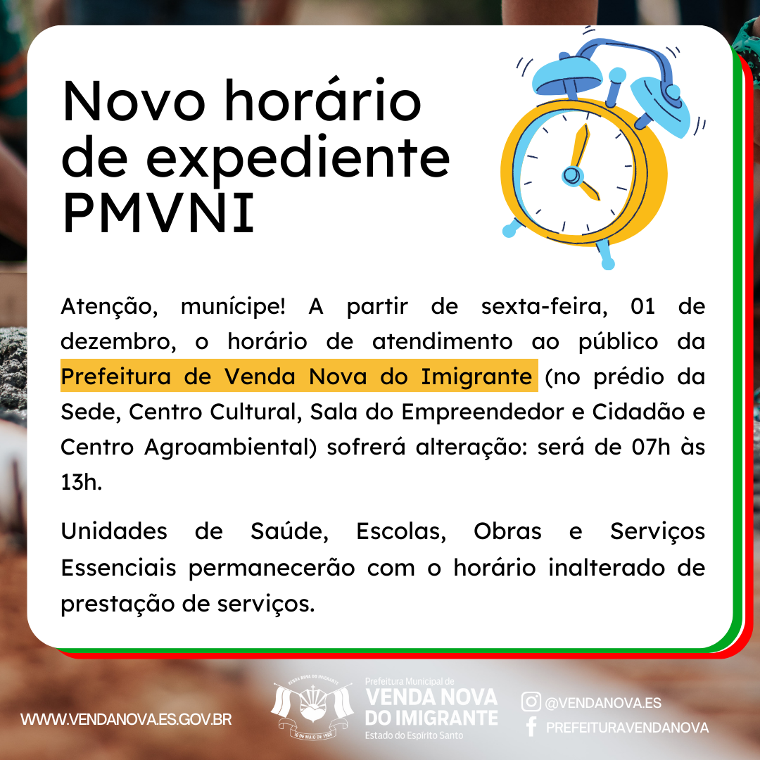 A partir de sexta-feira (01), o horário de atendimento ao público da Prefeitura de Venda Nova do Imigrante (Sede, Centro Cultural, Sala do Empreendedor e Cidadão e Centro Agroambiental) sofrerá alteração: será de 07h às 13h. Entretanto, a carga horária de cada servidor deverá ser respeitada, inclusive a dos servidores comissionados!