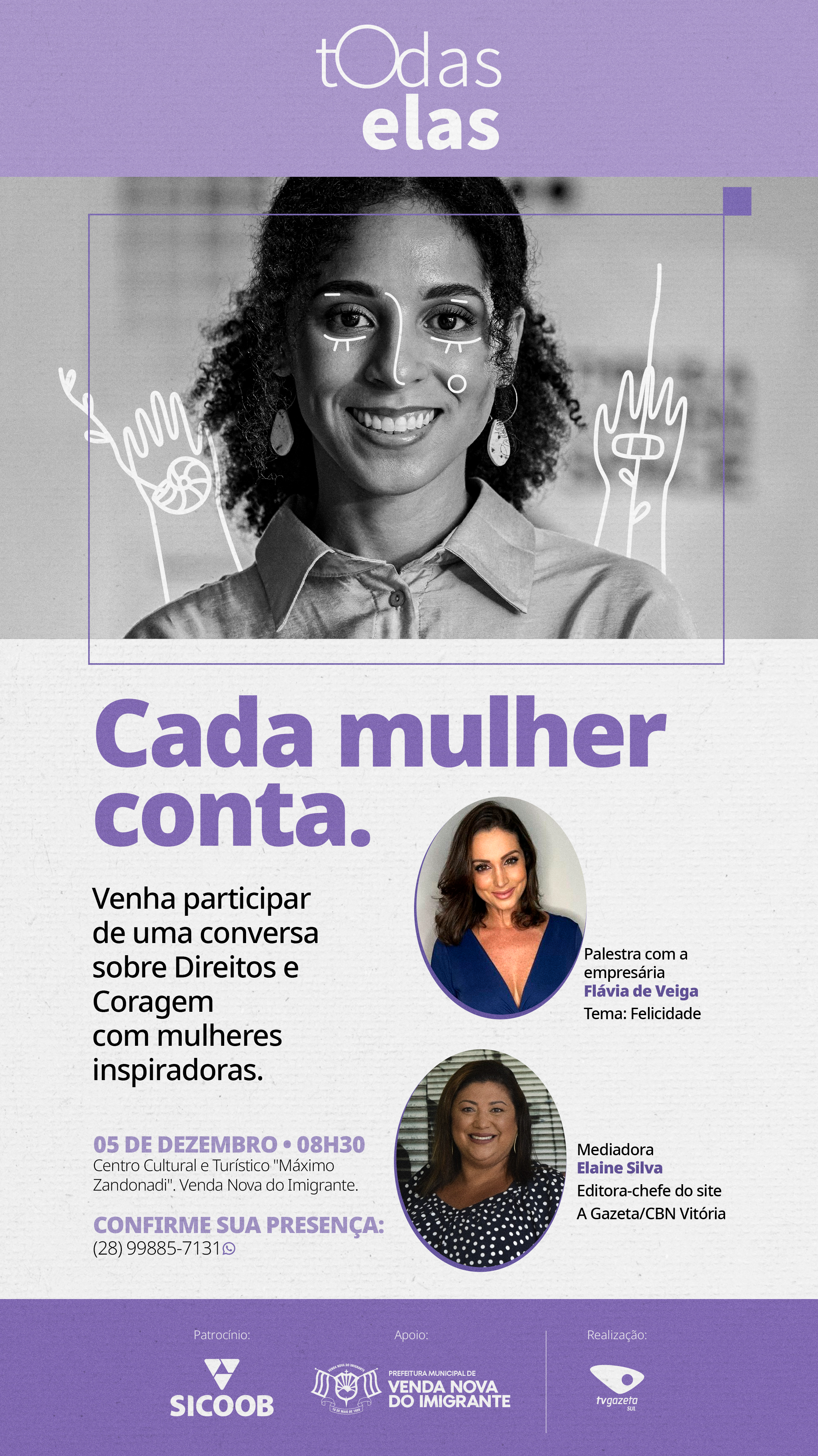 A Tv Gazeta Sul, com o apoio da Prefeitura de Venda Nova do Imigrante, realizará na próxima terça-feira (05), a partir das 08h30 no Centro Cultural e Turístico "Máximo Zandonadi", o "Todas Elas". O evento visa debater empreendedorismo, empoderamento e a luta pelos direitos da mulher. A entrada é gratuita.