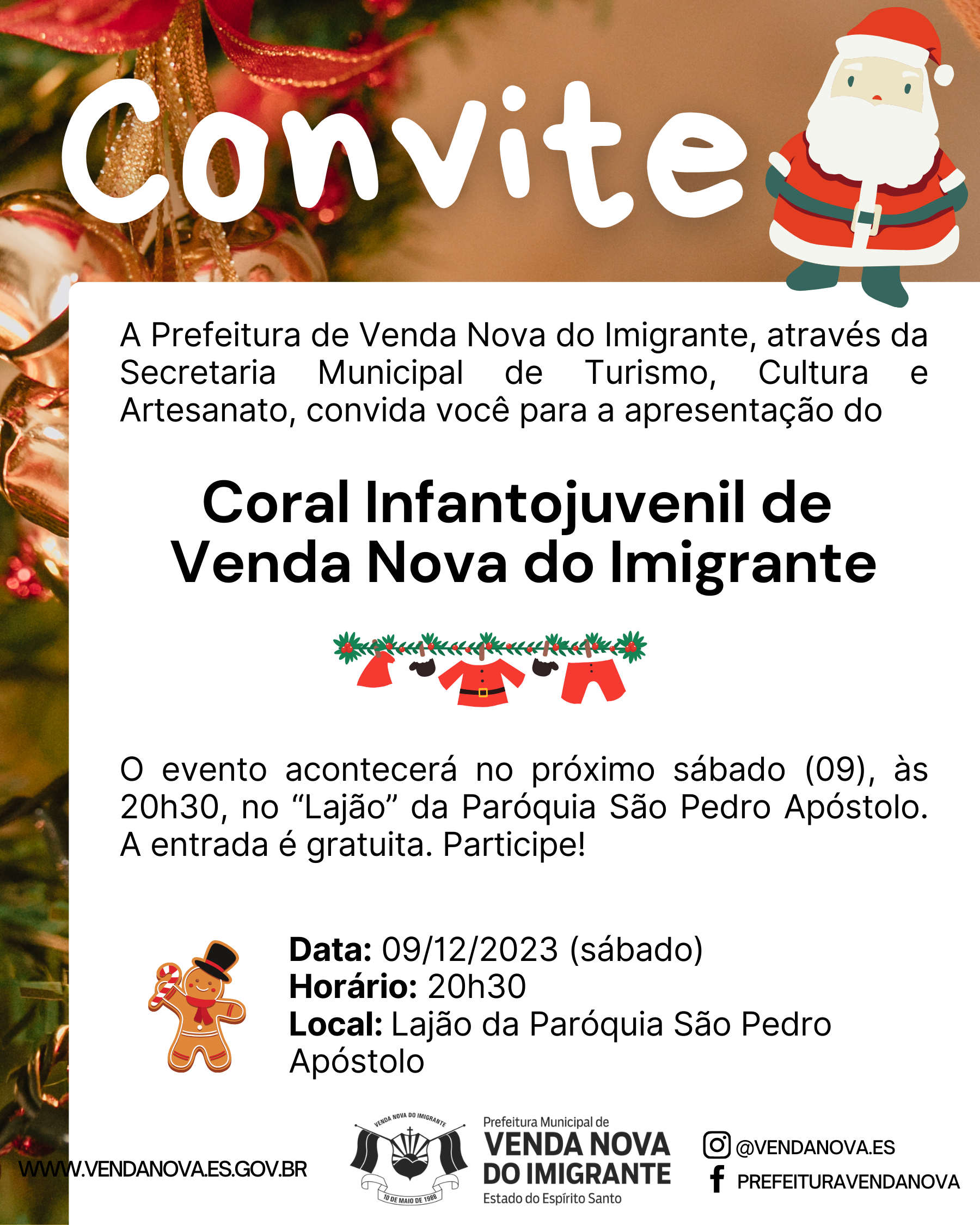 A Prefeitura de Venda Nova do Imigrante, através da Secretaria Municipal de Turismo, Cultura e Artesanato, convida você para a apresentação do Coral Infanto- juvenil de