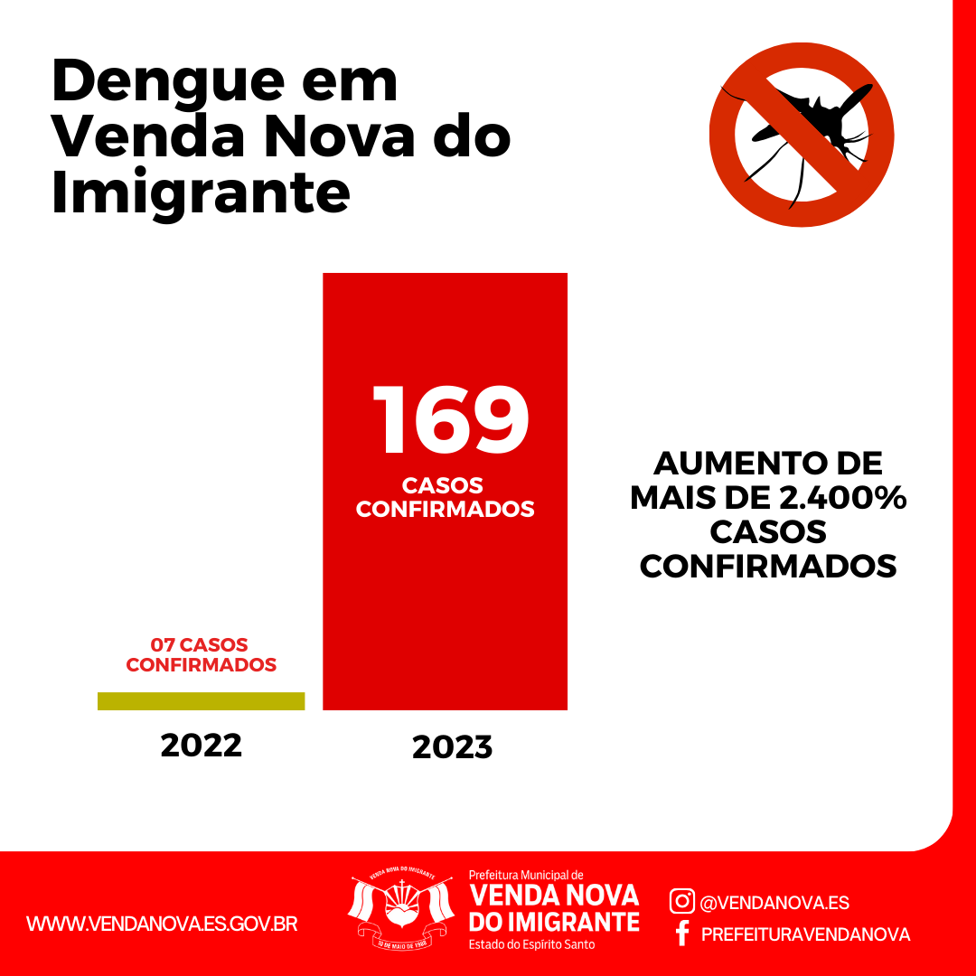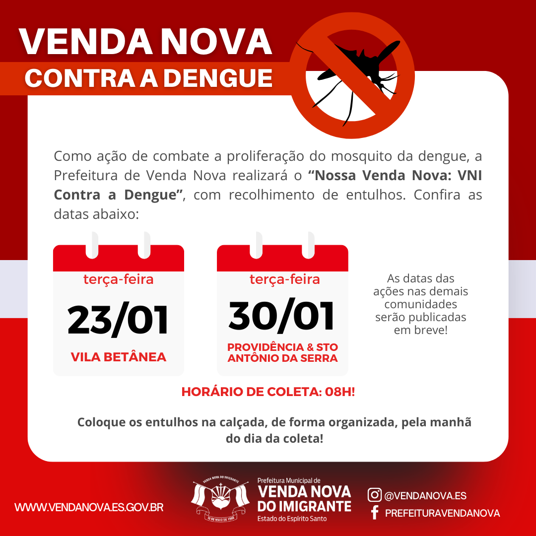 A Prefeitura de Venda Nova do Imigrante, através das secretarias municipais de Obras e Infraestrutura Urbana e Saúde, realizará nos dias 23 e 30 de janeiro, ação de combate a proliferação do mosquito da dengue no município. O "Nossa Venda Nova: VNI Contra a Dengue" contará com o recolhimento de entulhos nos bairros Vila Betânea, Providência e Santo Antônio da Serra.