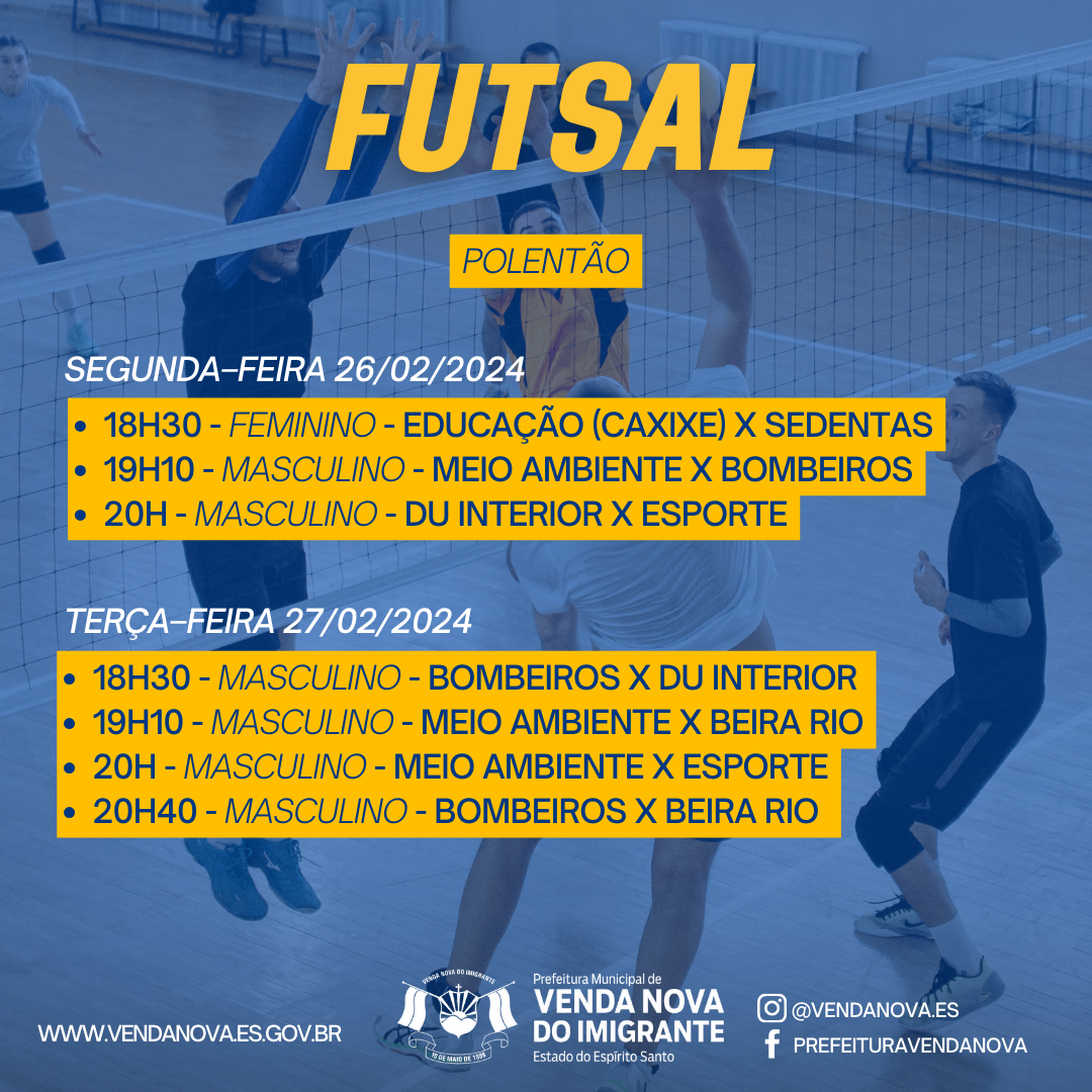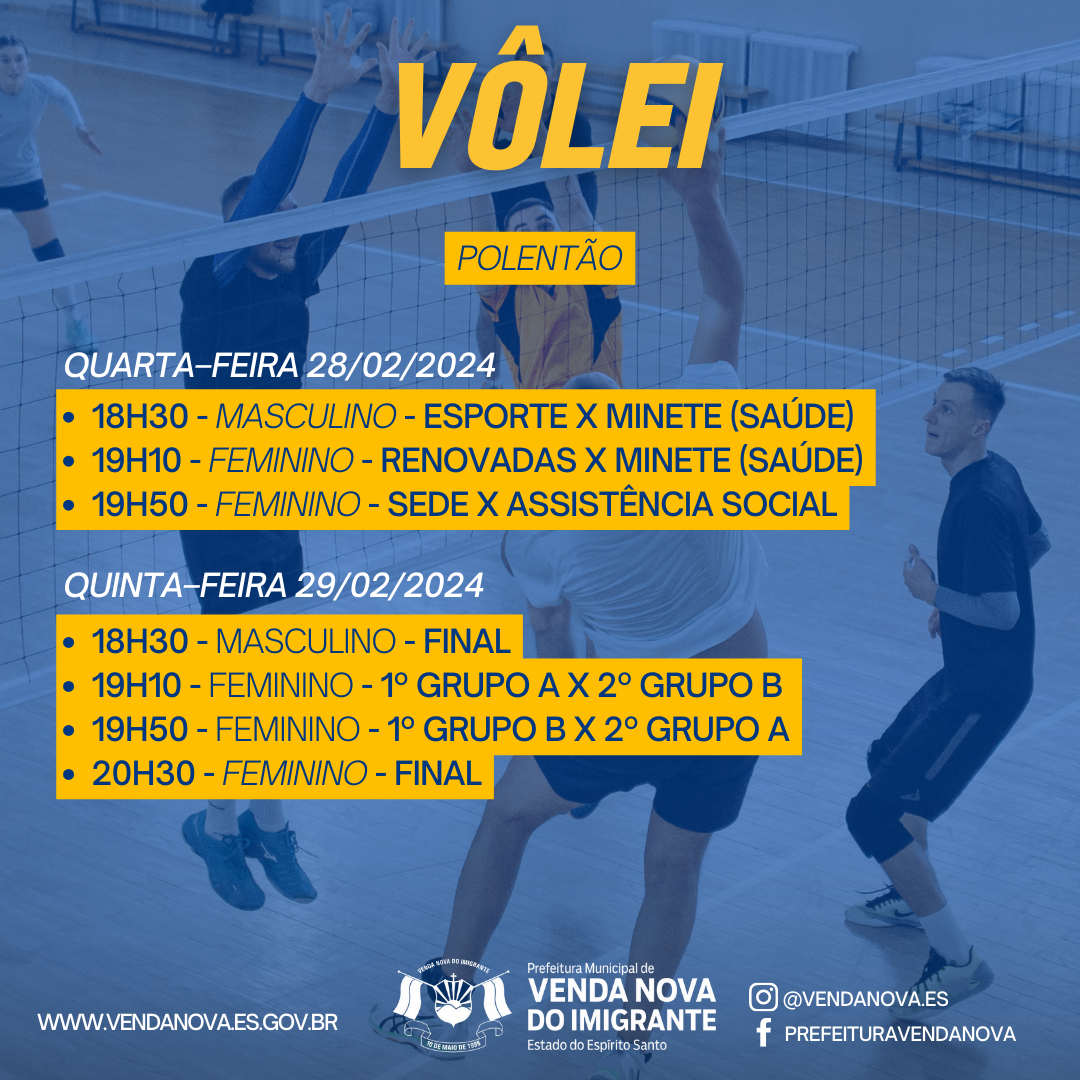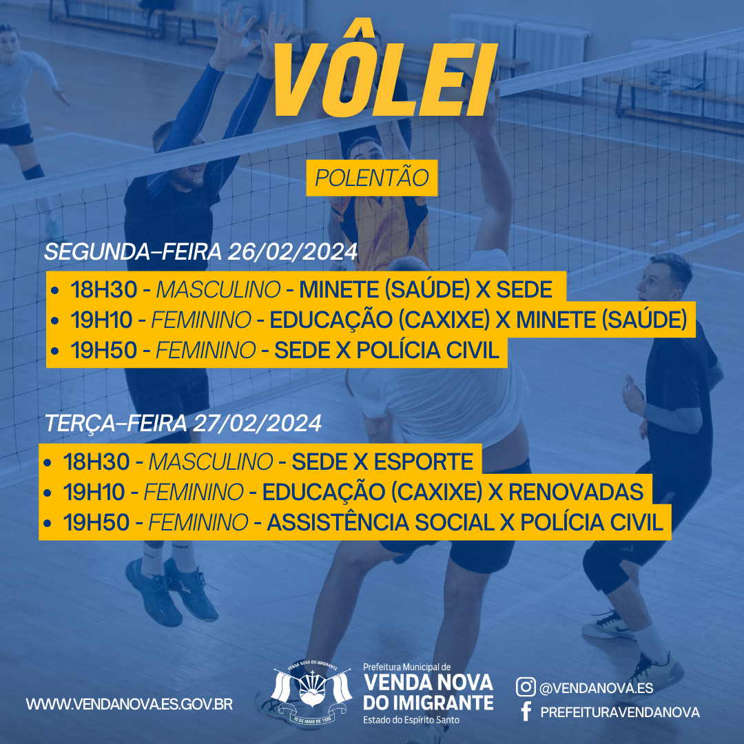 A Prefeitura de Venda Nova do Imigrante, através da Secretaria Municipal de Esporte e Lazer, realizará de 19 a 29 de fevereiro a segunda edição dos Jogos dos Servidores. Nova do Imigrante. A competição visa promover o intercambio social, despertar hábitos saudáveis e fomentar a prática esportiva nos funcionários públicos. Na segunda edição do evento, poderão participar dos jogos os funcionários públicos municipais e estaduais: servidores municipais, bombeiros, cartório eleitoral, fórum, Ministério Público, Polícia Civil, Policia Militar, bem como funcionários comissionados, de contratação temporária, terceirizados e estagiários. A comunidade pode torcer nos jogos. A entrada é gratuita.