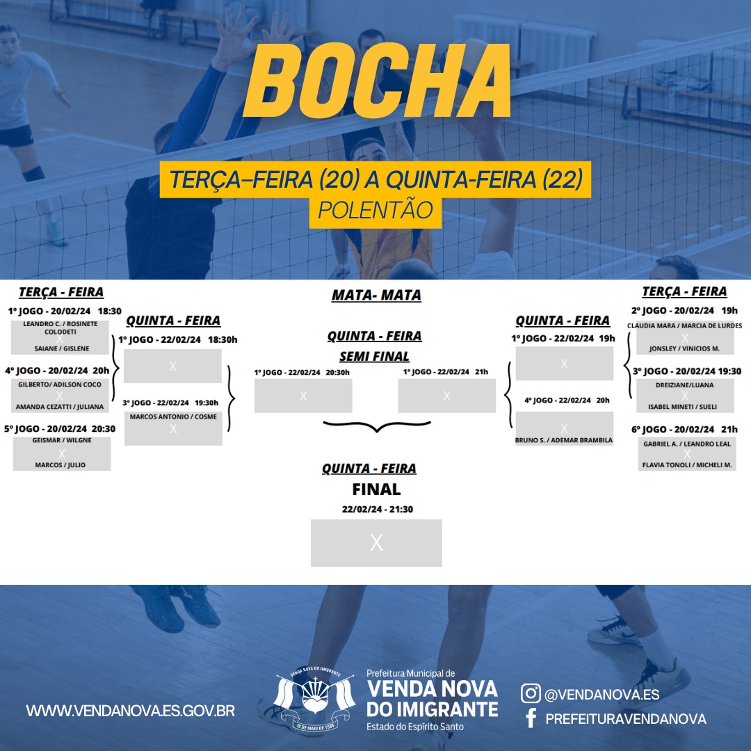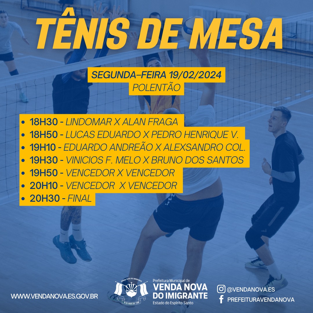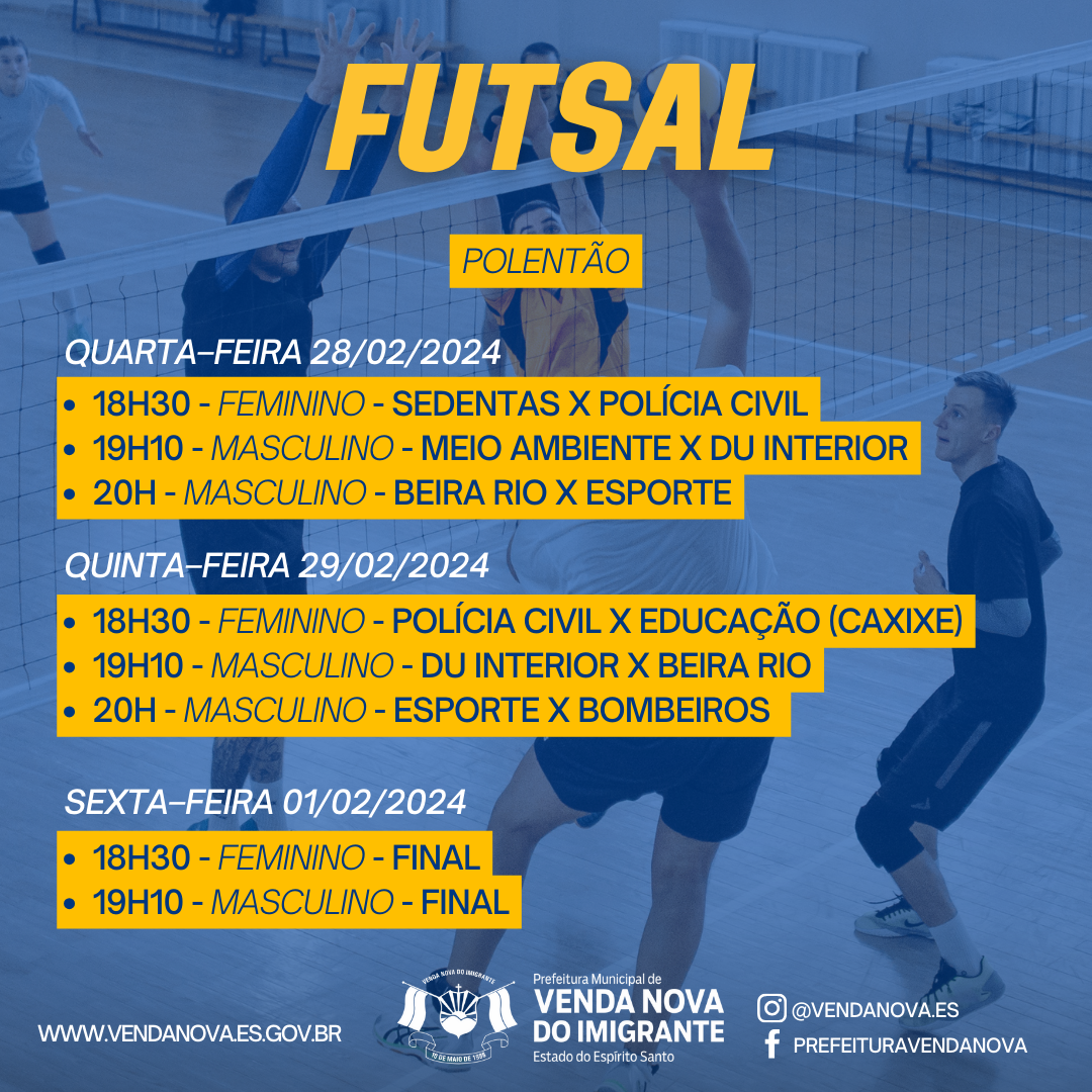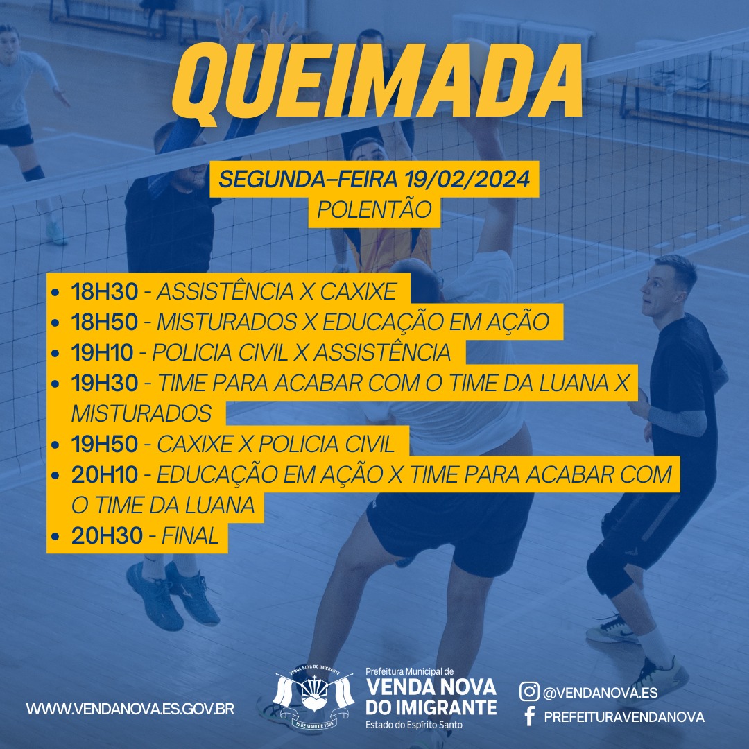 A Prefeitura de Venda Nova do Imigrante, através da Secretaria Municipal de Esporte e Lazer, realizará de 19 a 29 de fevereiro a segunda edição dos Jogos dos Servidores. Nova do Imigrante. A competição visa promover o intercambio social, despertar hábitos saudáveis e fomentar a prática esportiva nos funcionários públicos. Na segunda edição do evento, poderão participar dos jogos os funcionários públicos municipais e estaduais: servidores municipais, bombeiros, cartório eleitoral, fórum, Ministério Público, Polícia Civil, Policia Militar, bem como funcionários comissionados, de contratação temporária, terceirizados e estagiários. A comunidade pode torcer nos jogos. A entrada é gratuita.