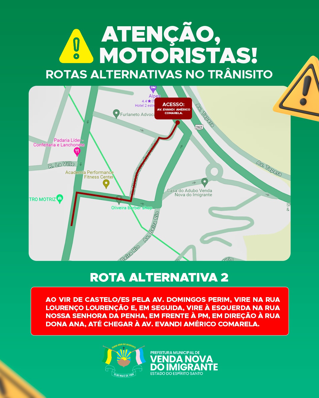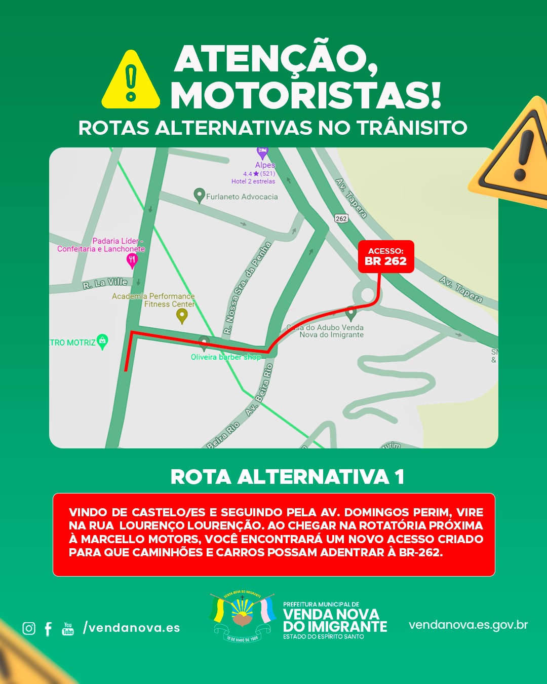 A Prefeitura de Venda Nova do Imigrante, interditou completamente a via lateral à BR-262, na altura da Brasilnova, para reparar a galeria fluvial e o trecho de rua de paralelepípedo. Em parceria com as polícias Militar e Rodoviária Federal e a Secretaria Municipal de Obras, foi necessária a abertura de um acesso provisório à rodovia federal. O prefeito, Paulinho Mineti, faz um apelo aos motoristas por cautela e paciência, solicitando compreensão diante da necessidade de adaptação a essa nova realidade.