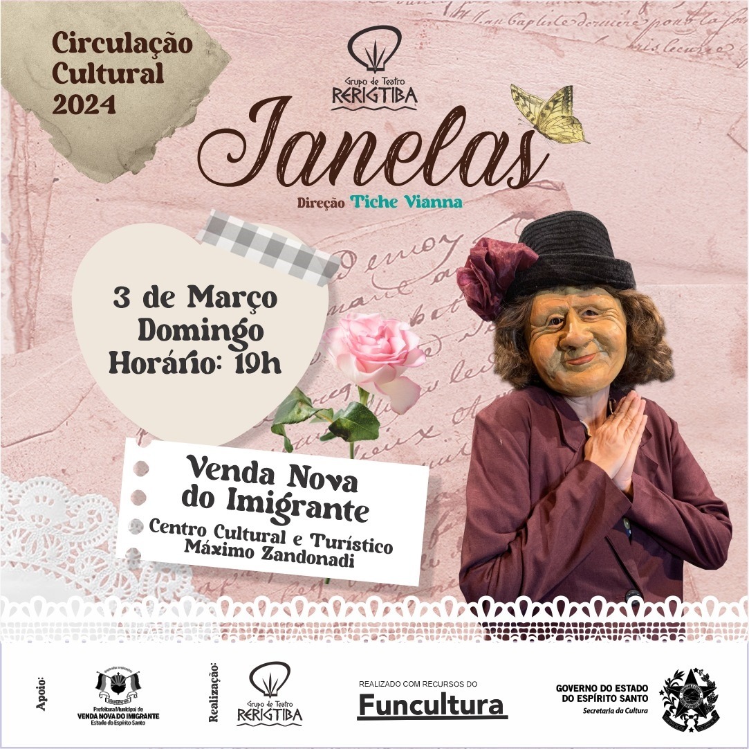 Cultura em Venda Nova do Imigrante. O Centro Cultural e Turístico "Máximo Zandonadi", será palco, no próximo domingo (03), da peça teatral  "Janelas", com direção de Tiche Viana. A entrada é gratuita.