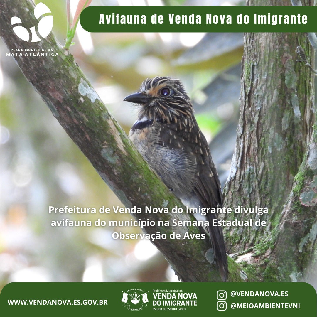 Na Semana Estadual de Observação de Aves (22 a 28/04), criada recentemente por meio da Lei nº 2090/24, a Prefeitura de Venda Nova do Imigrante divulga registros de aves de ocorrência no município que mostram a rica biodiversidade local. O levantamento de aves foi realizado para enriquecer o diagnóstico do Plano Municipal da Mata Atlântica e incentivar o turismo de natureza, como mais um atrativo para cidade que já é Capital Nacional do Agroturismo.