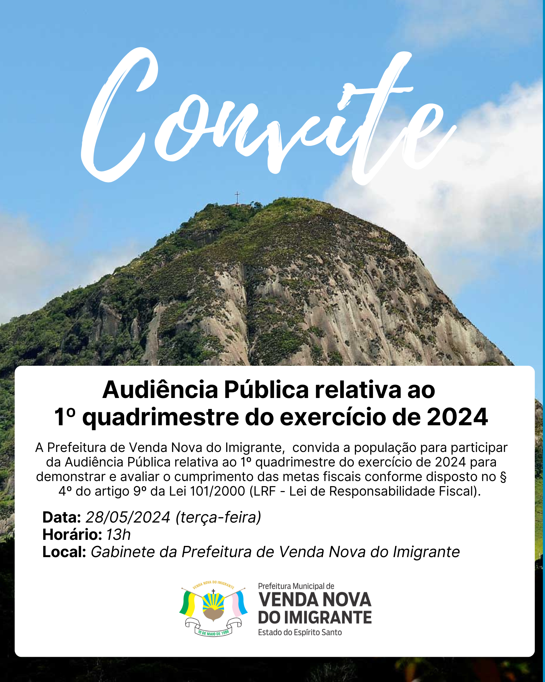 A Prefeitura de Venda Nova do Imigrante,  convida a população para participar da Audiência Pública relativa ao 1º quadrimestre do exercício de 2024 para demonstrar e avaliar o cumprimento das metas fiscais conforme disposto no § 4º do artigo 9º da Lei 101/2000 (LRF - Lei de Responsabilidade Fiscal).