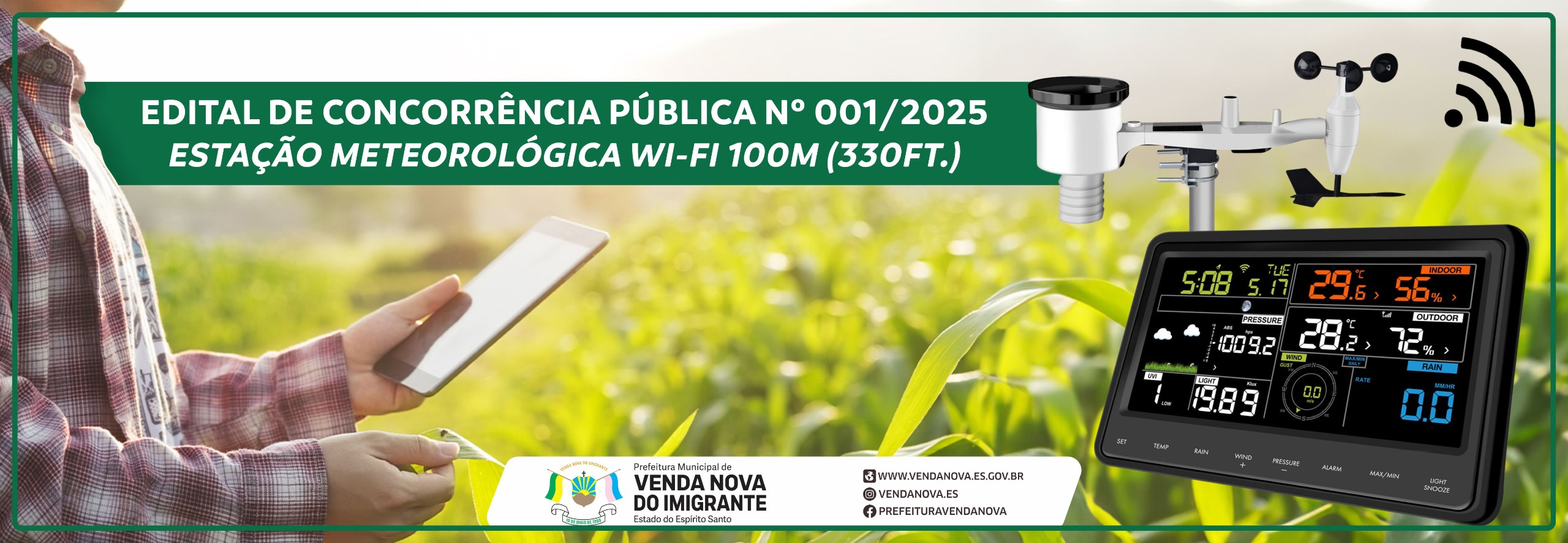 A Prefeitura Municipal de Venda Nova do Imigrante, lança nesta quarta-feira (22) um processo de CONCORRÊNCIA PÚBLICA para a concessão de outorga não-onerosa de uma Estação Meteorológica Wi-fi 100m (330ft.)