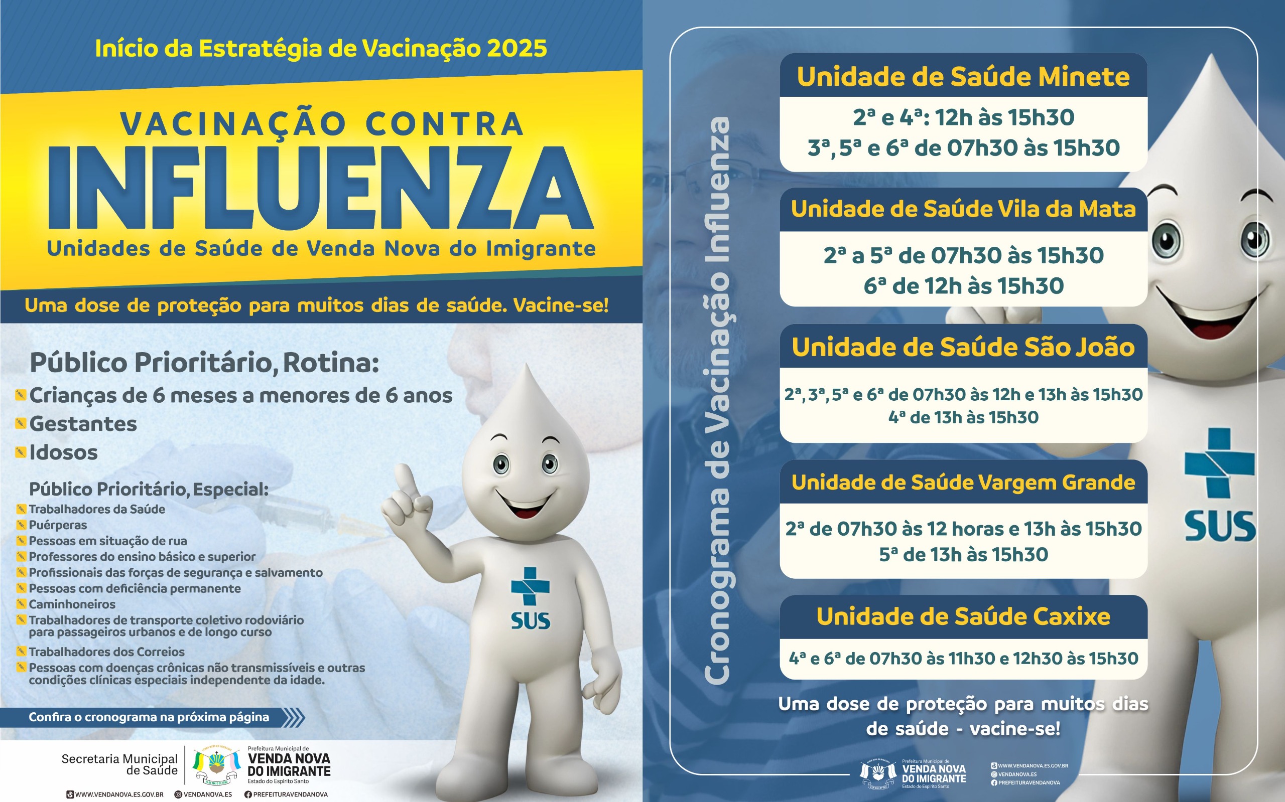 A campanha de vacinação contra a Influenza 2025 já está em andamento em Venda Nova do Imigrante. A Prefeitura, por meio da Secretaria Municipal de Saúde, está disponibilizando as doses nas Unidades de Saúde do município, conforme cronograma de atendimento de cada local (abaixo)