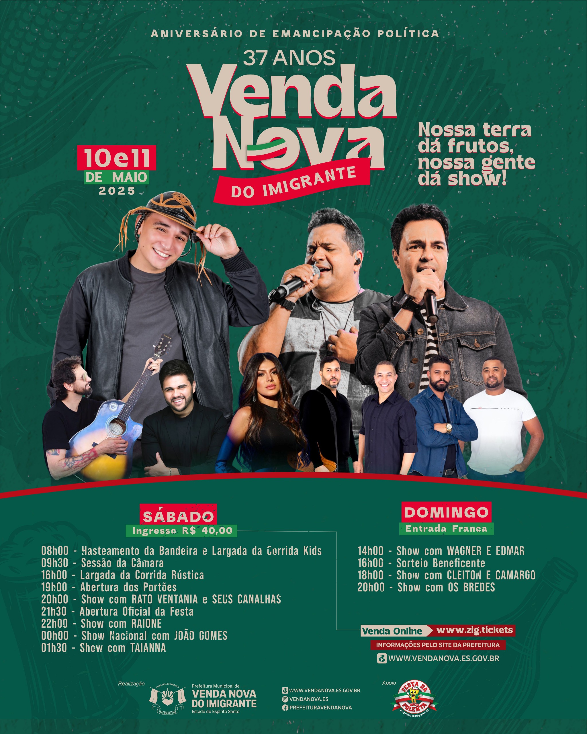 A Prefeitura de Venda Nova do Imigrante anuncia a programação oficial da Festa de Emancipação Política, que acontece nos dias 10 e 11 de maio, reunindo atividades cívicas, esportivas e atrações musicais nacionais e locais. A comemoração celebra os 37 anos de Emancipação Política do Município, com dois dias de festa para todas as idades.