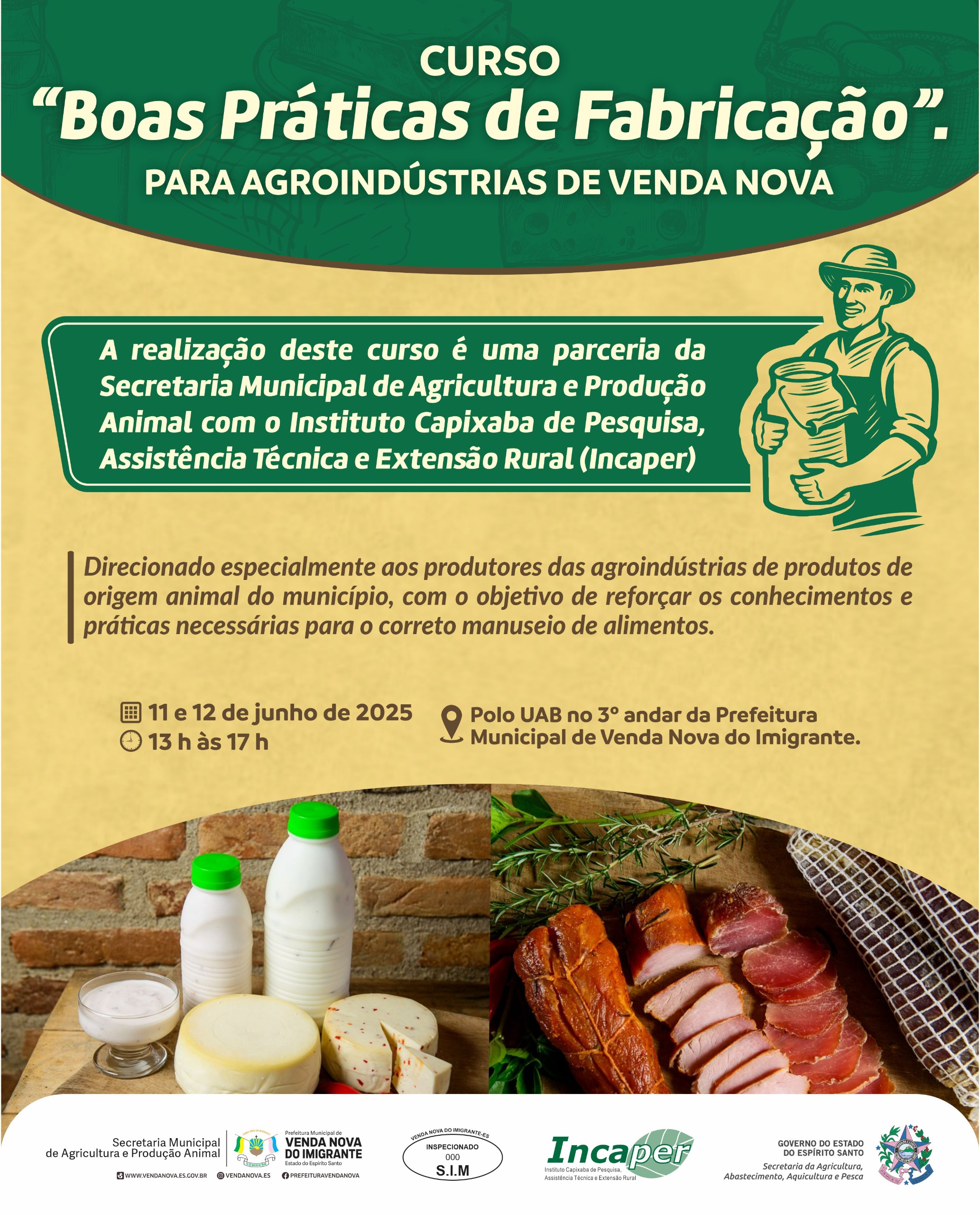A Prefeitura de Venda Nova do Imigrante, por meio da Secretaria Municipal de Agricultura e Produção Animal, em parceria com o Instituto Capixaba de Pesquisa, Assistência Técnica e Extensão Rural (Incaper), vai ofertar o curso “Boas Práticas de Fabricação” nos dias 11 e 12 de junho de 2025, das 13h às 17h, no Polo UAB, localizado no 3º andar da Prefeitura Municipal.