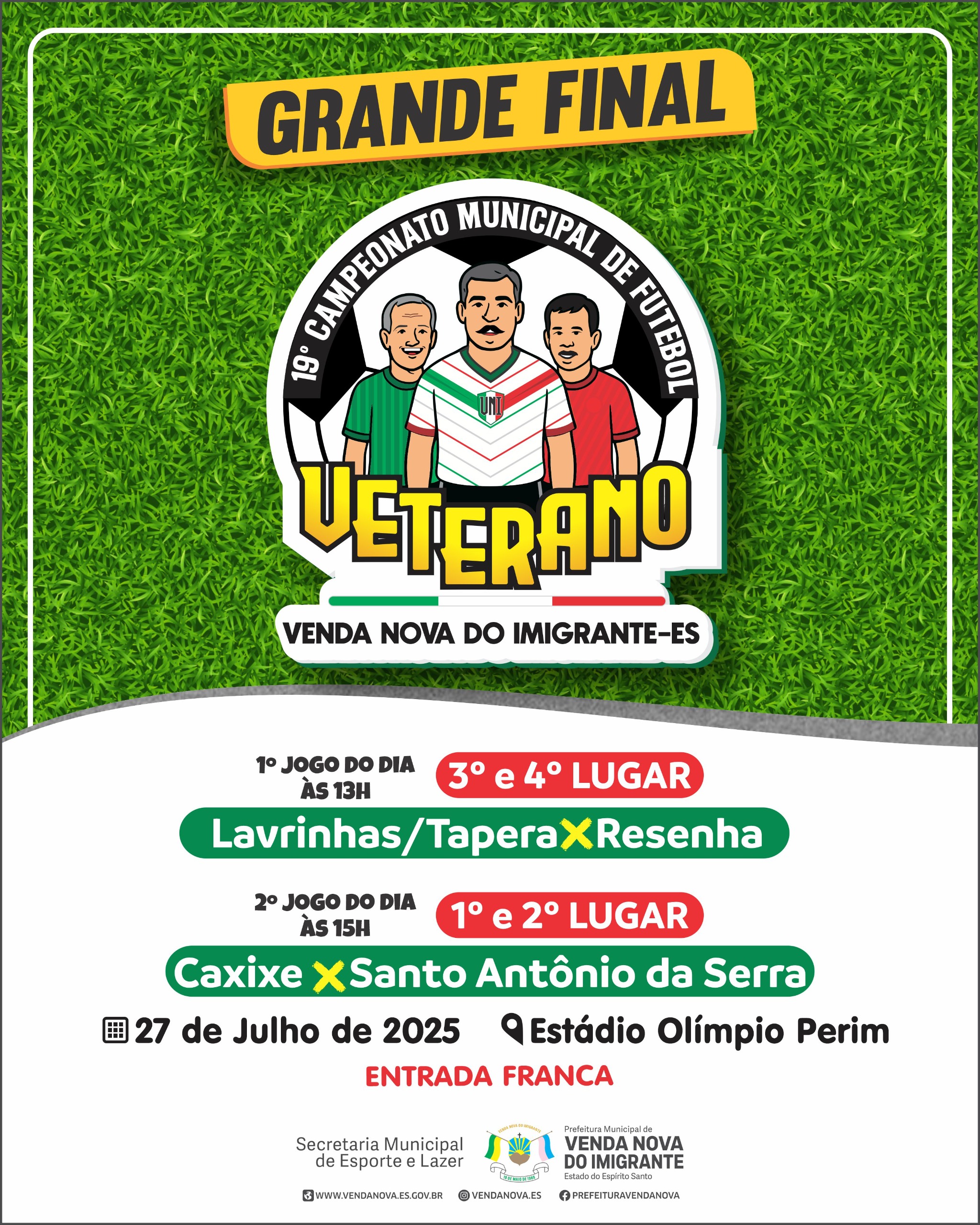 O Estádio Olímpio Perim será palco da grande final do 19° Campeonato Municipal de Futebol Veterano, que acontece neste domingo, 27 de julho, com dois jogos decisivos.A partir das 13h, o público poderá acompanhar a disputa pelo 3º lugar entre Lavrinhas/Tapera e Resenha. Já às 15h, é hora da grande decisão: Caxixe e Santo Antônio da Serra entram em campo em busca do título da edição 2025.