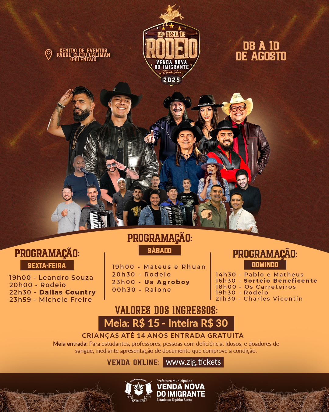 Entre os dias 8 e 10 de agosto, o Centro de Eventos Padre Cleto Caliman (Polentão) será palco da 23ª Festa de Rodeio de Venda Nova do Imigrante. Realizada pela Prefeitura Municipal, por meio da Secretaria de Turismo, Cultura e Artesanato, a tradicional festa reúne esporte, cultura, entretenimento e solidariedade.