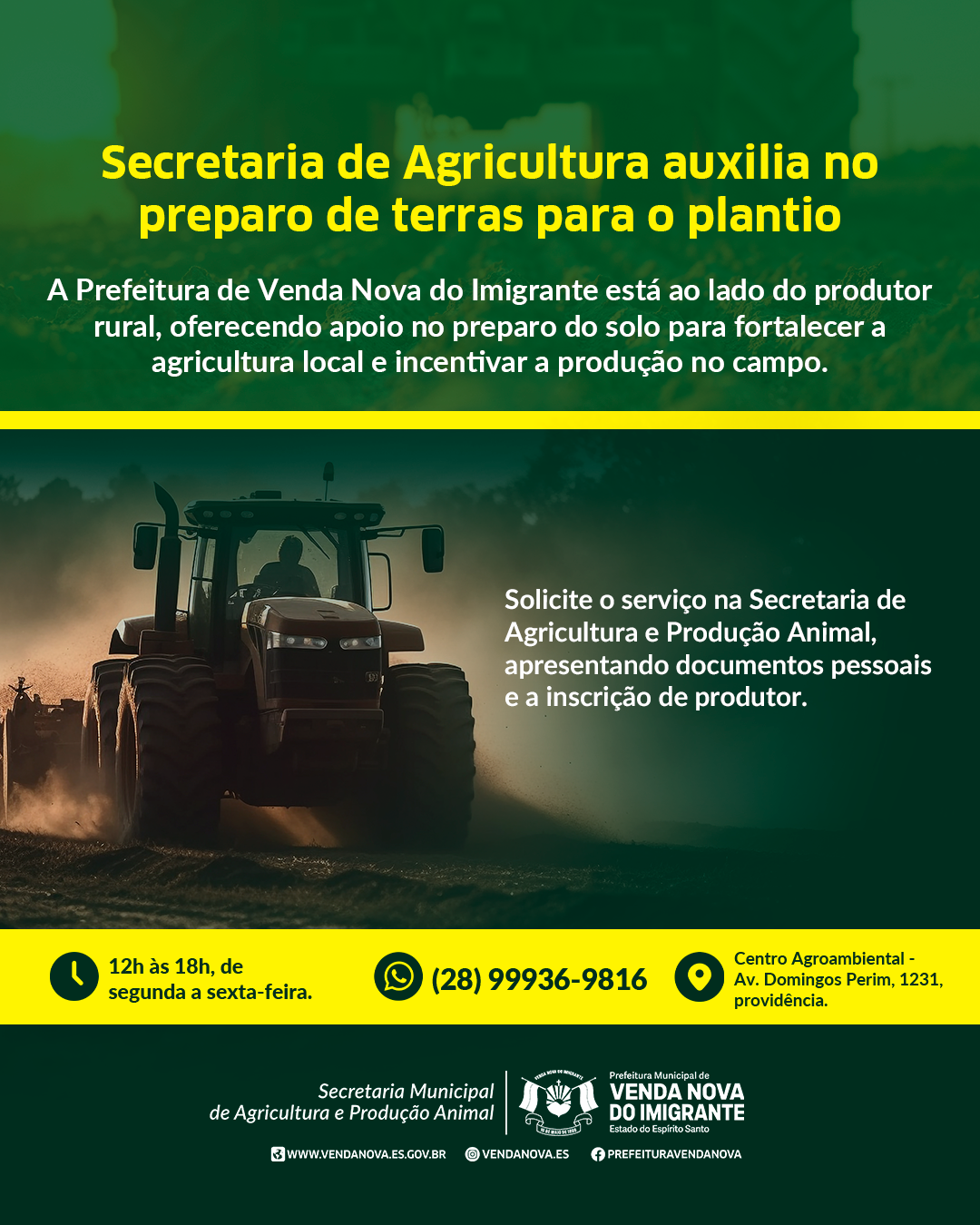 A Prefeitura de Venda Nova do Imigrante, por meio da Secretaria Municipal de Agricultura e Produção Animal, segue ao lado do produtor rural oferecendo apoio no preparo da terra para o plantio. O serviço tem como objetivo fortalecer a agricultura local, garantir melhores condições de produção e incentivar o desenvolvimento no campo.