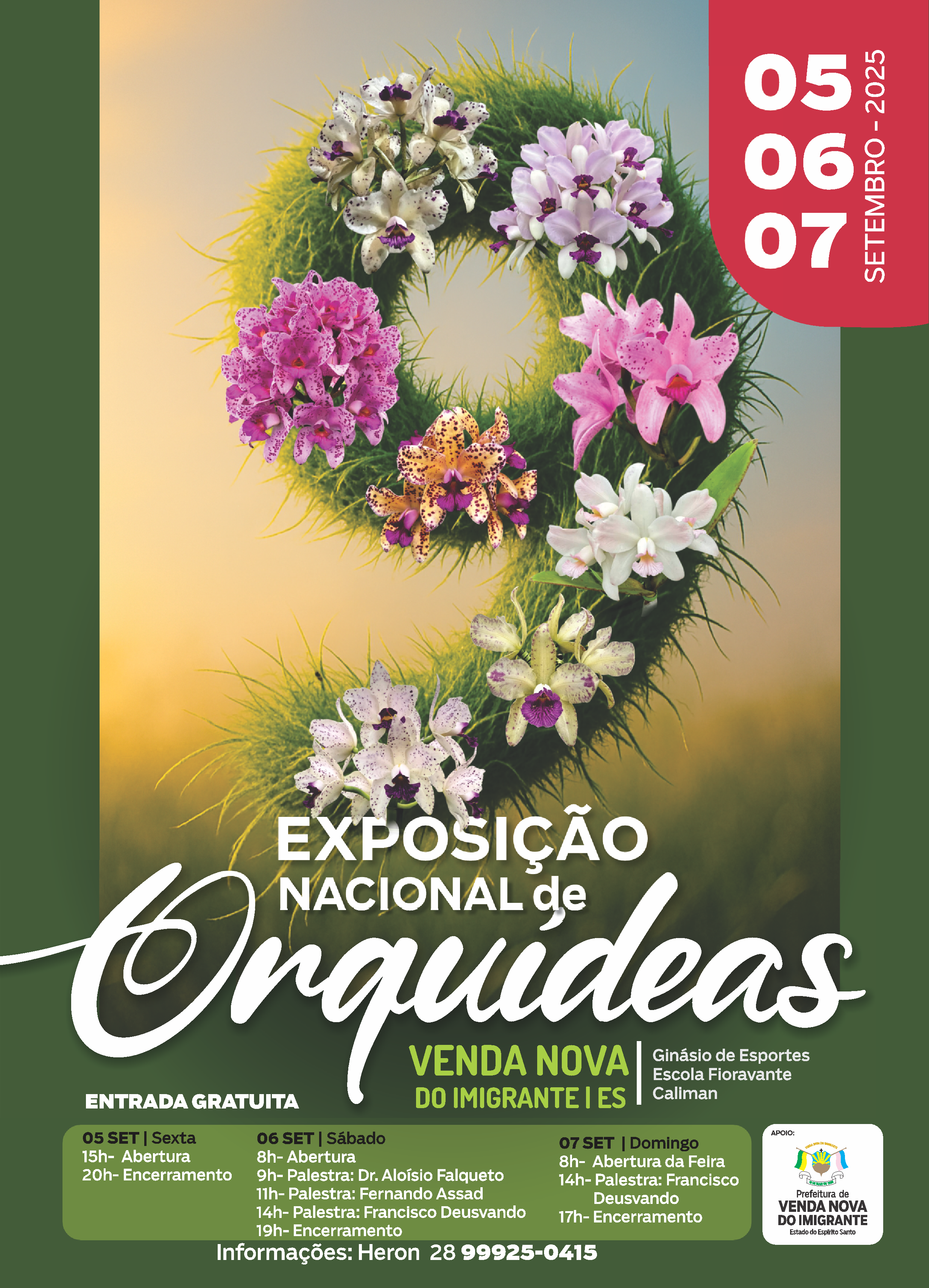 O evento é um dos mais aguardados do calendário de Venda Nova, reunindo orquidófilos, colecionadores, produtores e admiradores de diversas regiões do Brasil. De 05 a 07 de setembro, no Ginásio de Esportes da Escola Fioravante Caliman, com entrada gratuita!