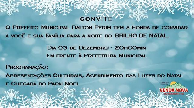 A prefeitura municipal de Venda Nova do Imigrante está convidando toda a população do município para participar do evento "Brilho de Natal", a partir das 20 horas do dia 03 de dezembro (quarta-feira), em frente ao prédio da prefeitura (centro de Venda Nova).