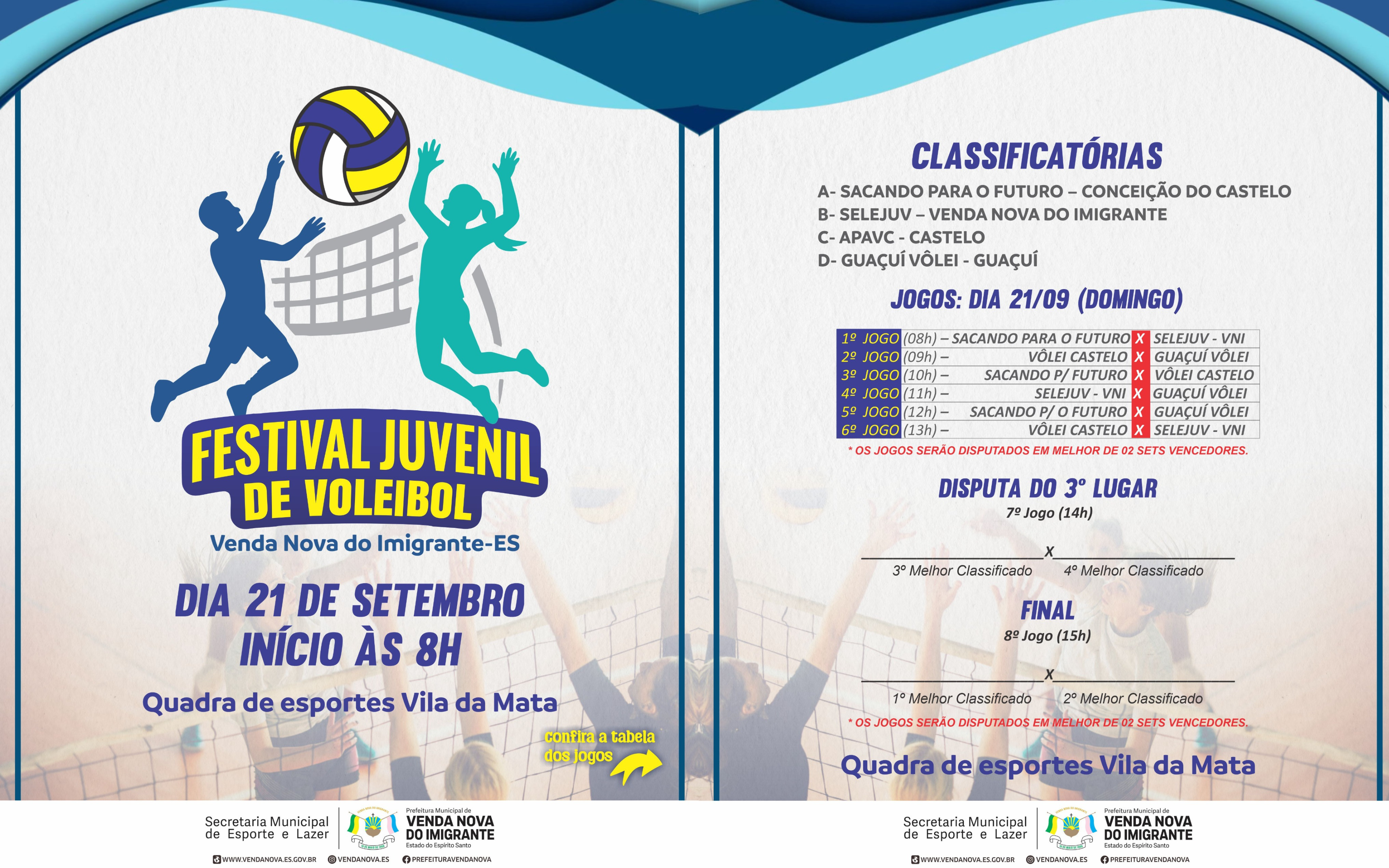 Também no domingo, a partir das 8h, a cidade será palco do Festival Juvenil de Voleibol Feminino, realizado na Quadra de Esportes da Vila da Mata. A competição será disputada no formato quadrangular e contará com as equipes Sacando para o Futuro (Conceição do Castelo), Selejuv (Venda Nova do Imigrante), APAVC (Castelo) e Guaçuí Vôlei (Guaçuí). Os jogos seguem ao longo do dia, com finais programadas para às 15h.