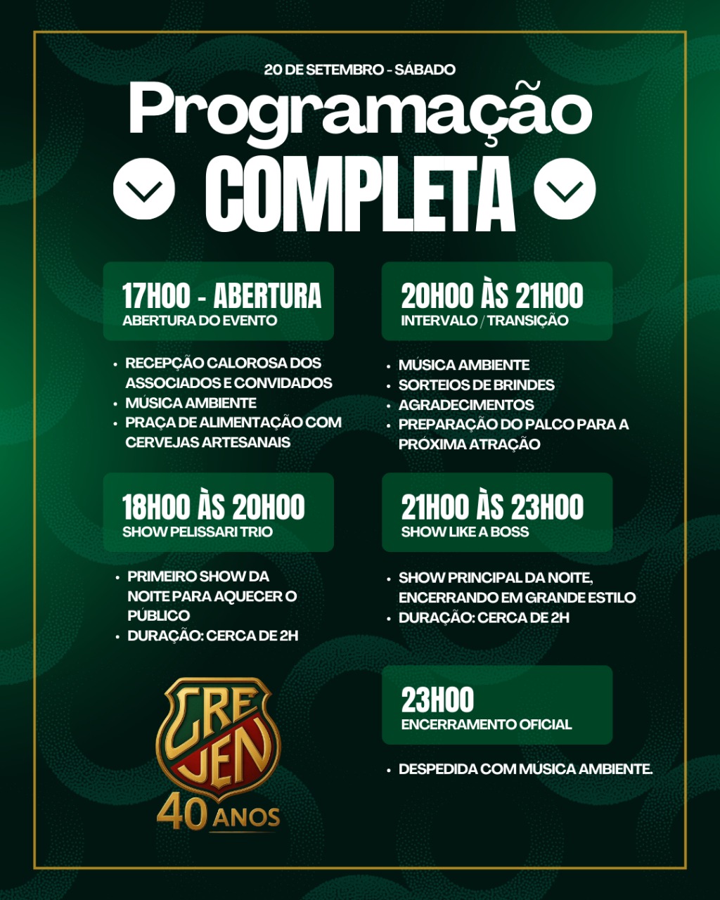 Ainda no sábado, o Clube Recreativo Creven comemora seus 40 anos de fundação com uma programação festiva. A abertura está marcada para as 17h, com música ambiente, sorteios e praça de alimentação. Às 18h, a banda Pelissari Trio sobe ao palco para animar o público, e às 21h será a vez do show principal com a banda Like a Boss. A entrada é gratuita para sócios, enquanto convidados não sócios podem adquirir ingresso a R$ 35.