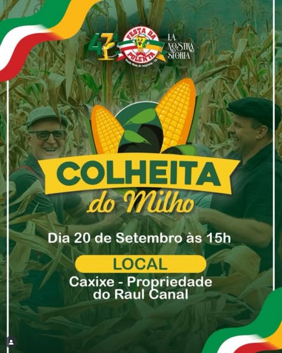 No sábado (20), às 15h, acontece a tradicional Colheita do Milho da Festa da Polenta, na propriedade de Raul Canal, no Caxixe. O evento simboliza a preparação para a 47ª Festa da Polenta, que neste ano será realizada no dias 03,04,05 e 09,10,11,12 de outubro com o tema “La Nostra Storia”. O milho que será colhido neste sábado foi plantado pelos voluntários no dia 15 de março deste ano.