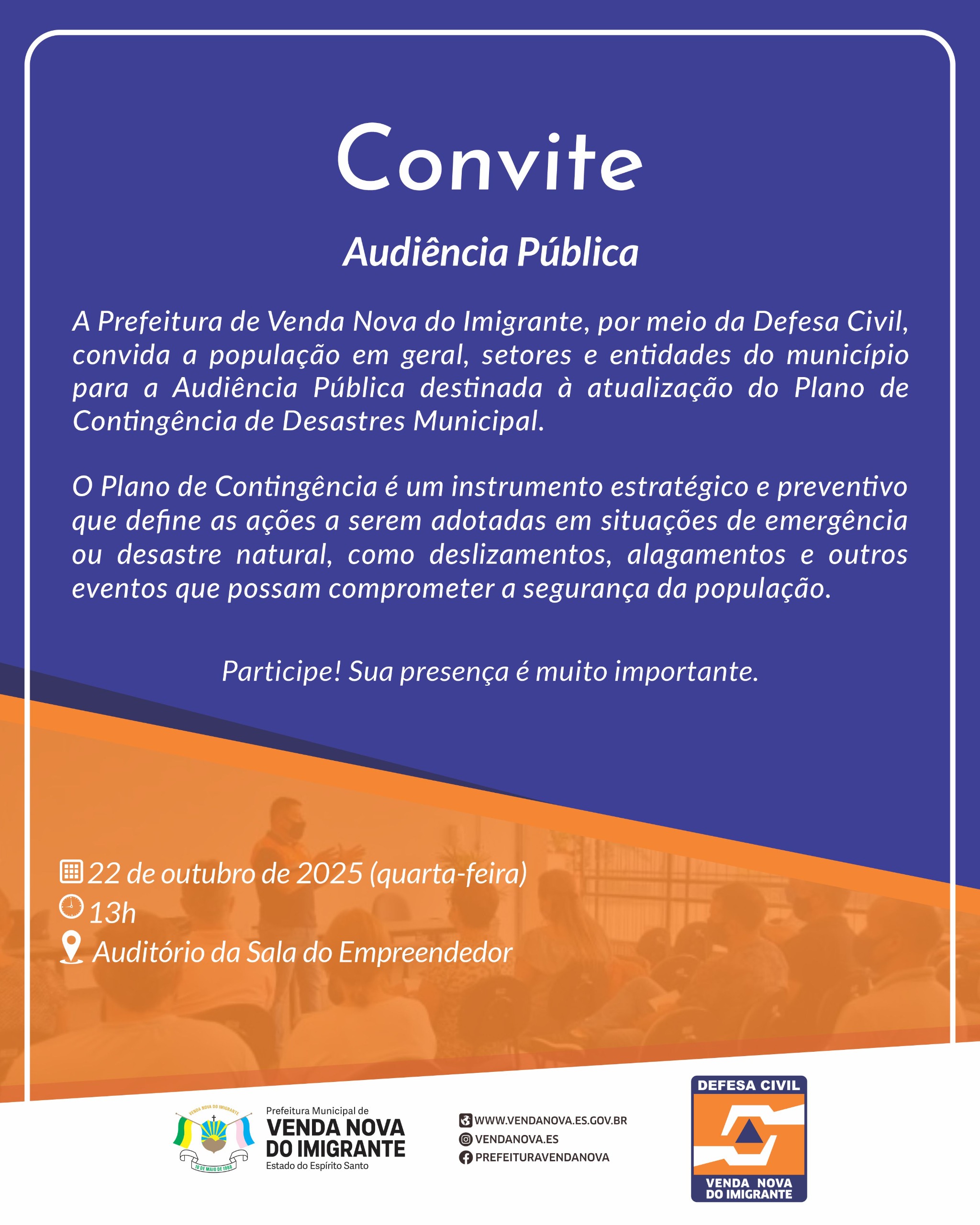 A Prefeitura de Venda Nova do Imigrante, por meio da Defesa Civil Municipal, realiza no próximo dia 22 de outubro (terça-feira) uma audiência pública destinada à atualização do Plano de Contingência de Desastres Municipal. O encontro acontecerá às 13h, no auditório da Sala do Empreendedor e do Cidadão, localizada ao lado do Fórum.