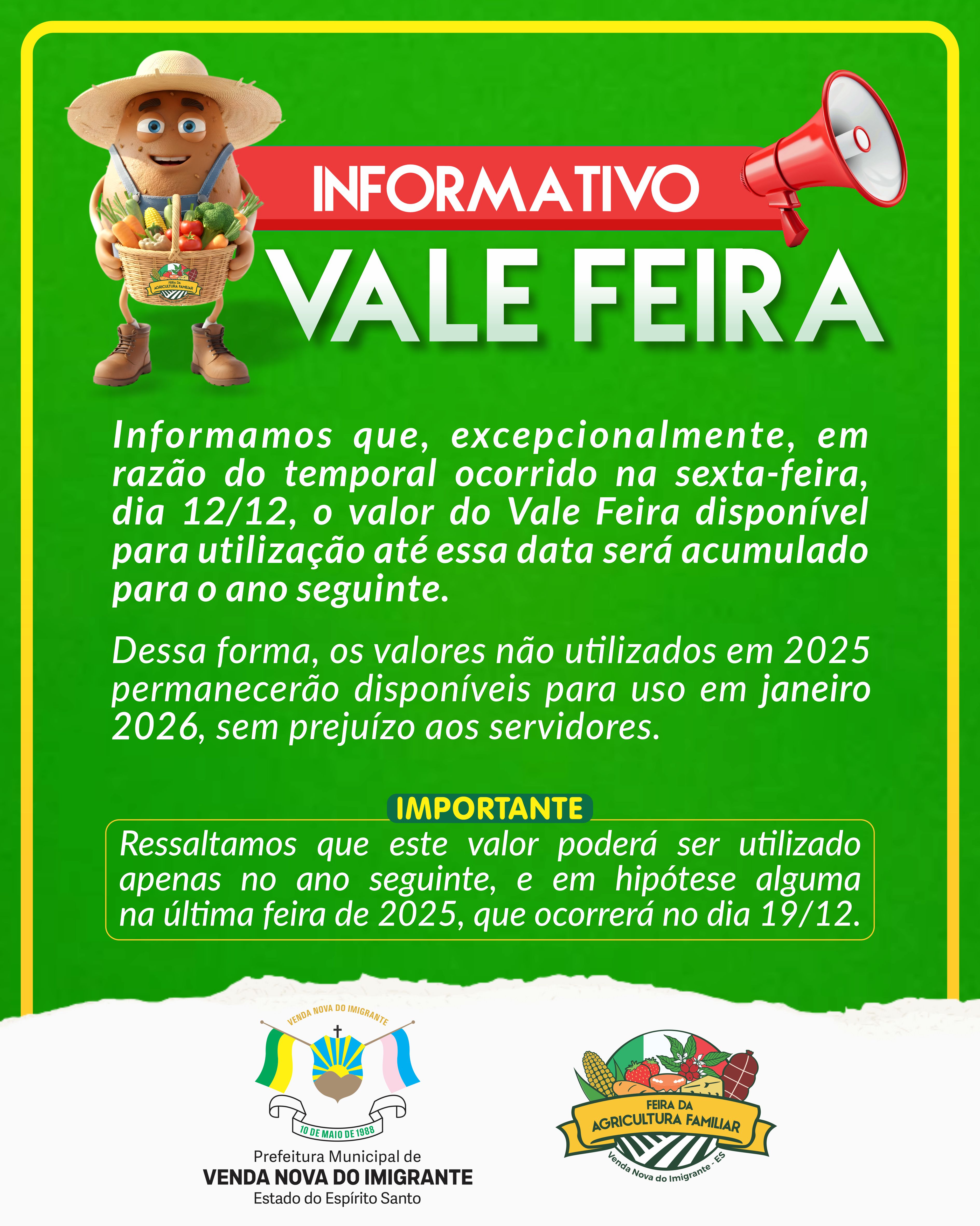 Informamos que, excepcionalmente, em razão do temporal ocorrido na sexta-feira, dia 12/12, o valor do Vale Feira dos Servidores Municipais disponível para utilização até essa data será acumulado para o ano seguinte.