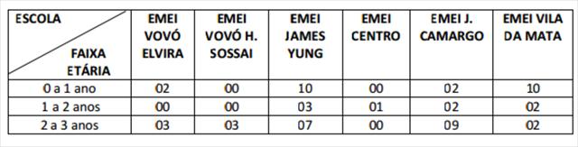 Confira no quadro abaixo a quantidade de vagas oferecidas por faixa etária e escola: