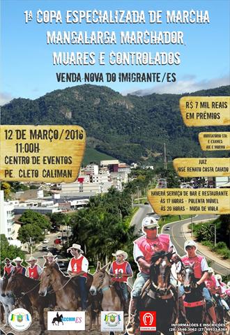 Venda Nova do Imigrante será palco da 1ª Copa Especializada de Marcha Mangalarga Marchador, Muares e Controlados, que será realizada no Centro de Eventos Pe. Cleto Caliman, no dia 12 de março de 2016, a partir das 11 horas.