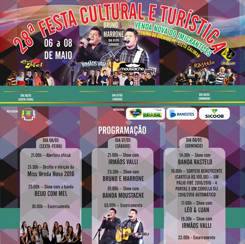A prefeitura de Venda Nova do Imigrante fechou a programação da 28ª Festa Cultural e Turística em homenagem à emancipação do município. A grande atração deste ano é o show da dupla Bruno & Marrone, na noite de sábado (07 de maio). A entrada no Centro de Eventos Pe. Cleto Caliman (Polentão) será gratuita na sexta-feira (06 de maio) e no domingo (08 de maio). Somente no sábado será cobrado ingresso, a R$ 30,00 entrada inteira e R$ 15,00 meia entrada. Os ingressos já estão sendo vendidos na loja Tânea Modas.