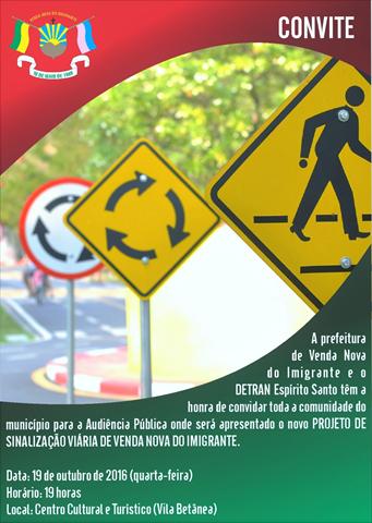 A prefeitura municipal de Venda Nova do Imigrante e o DETRAN Espírito Santo estão convidando toda a comunidade para participar da Audiência Pública em que será apresentado o projeto da nova sinalização viária do município.
