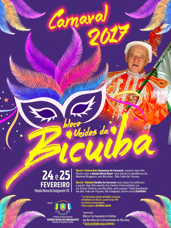 A alegria e a animação do carnaval não vão faltar em Venda Nova do Imigrante em 2017. A Prefeitura e o bloco Unidos da Bicuíba prepararam dois dias de diversão para as famílias vendanoveses. Marchinhas, mini trio elétrico e até as tradicionais fantasias vão compor a folia, que acontece há mais de 15 anos.