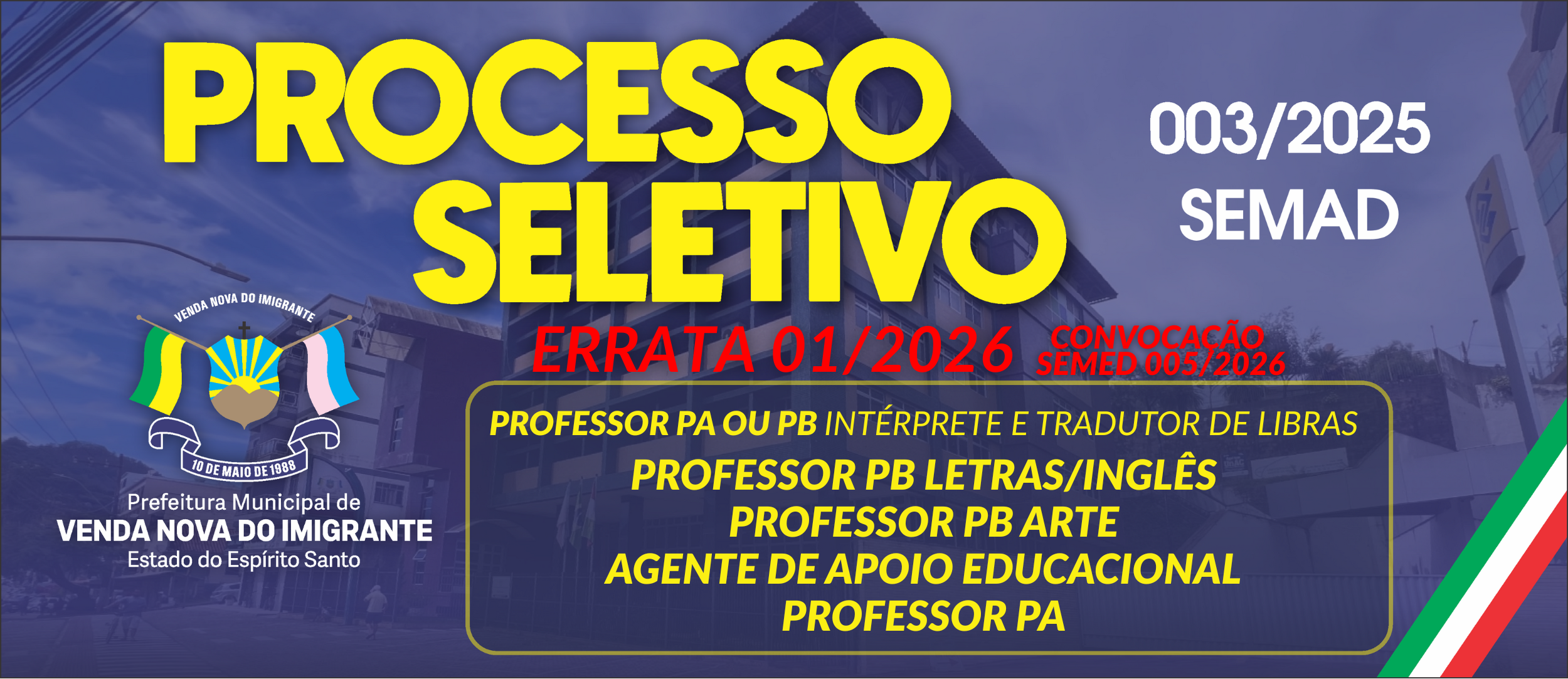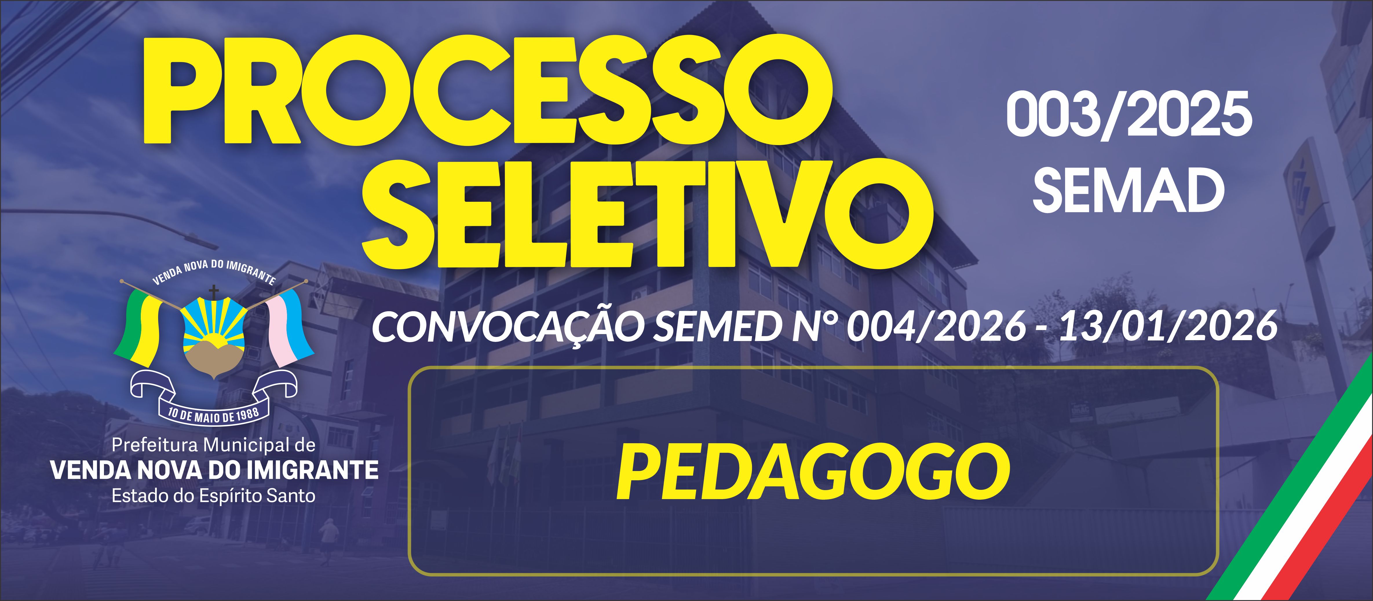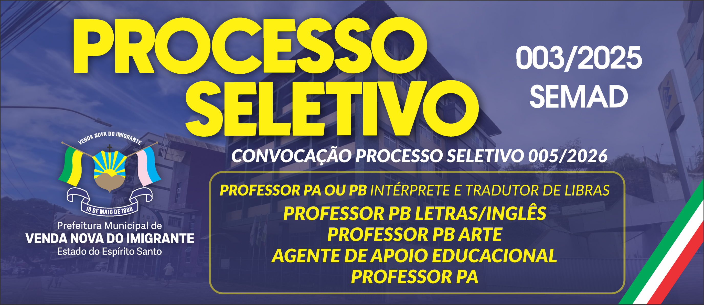 A PREFEITURA MUNICIPAL DE VENDA NOVA DO IMIGRANTE, por intermédio da Secretaria Municipal de Educação, usando de suas atribuições legais para a contratação temporária de PROFISSIONAIS DE EXCEPCIONAL INTERESSE PÚBLICO, considerando o disposto no Edital Processo Seletivo Público SEMAD nº 003/2025, com resultado, devidamente publicado.