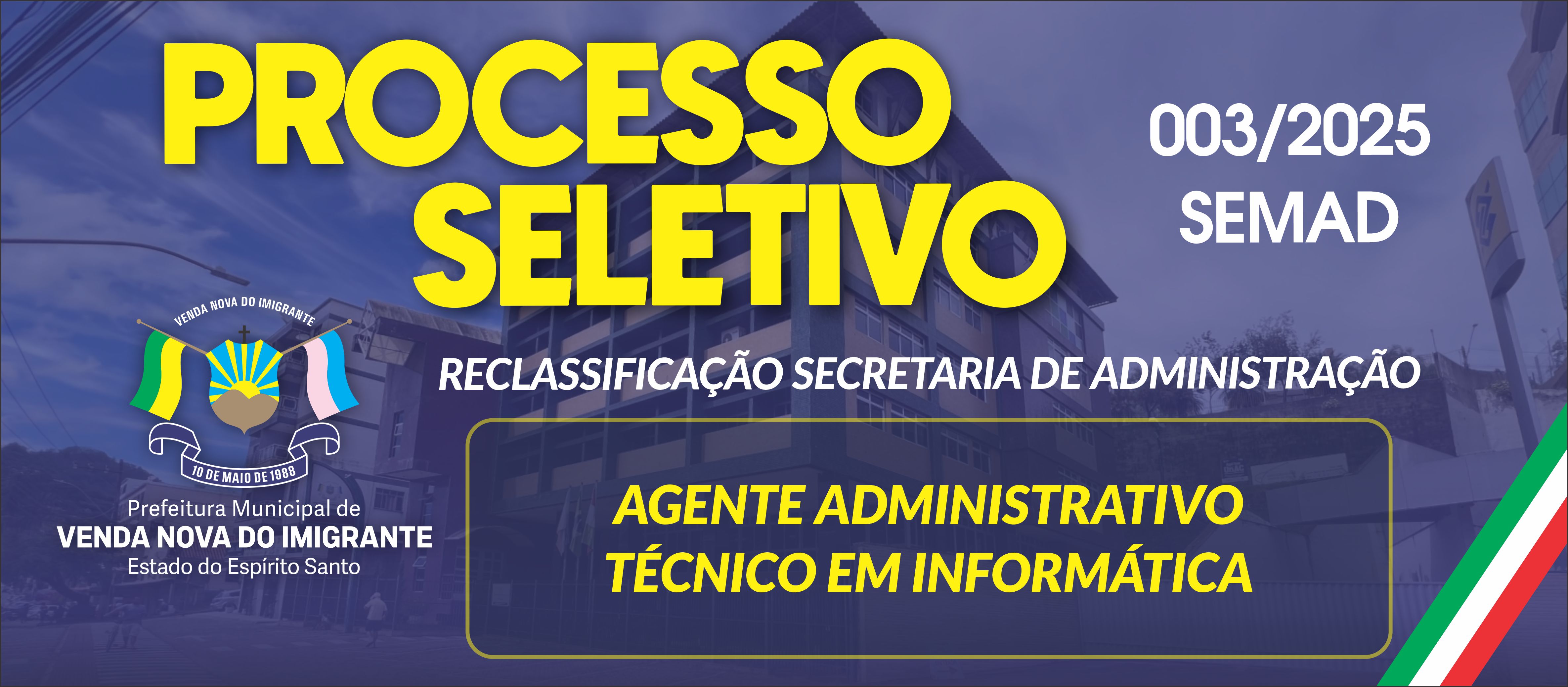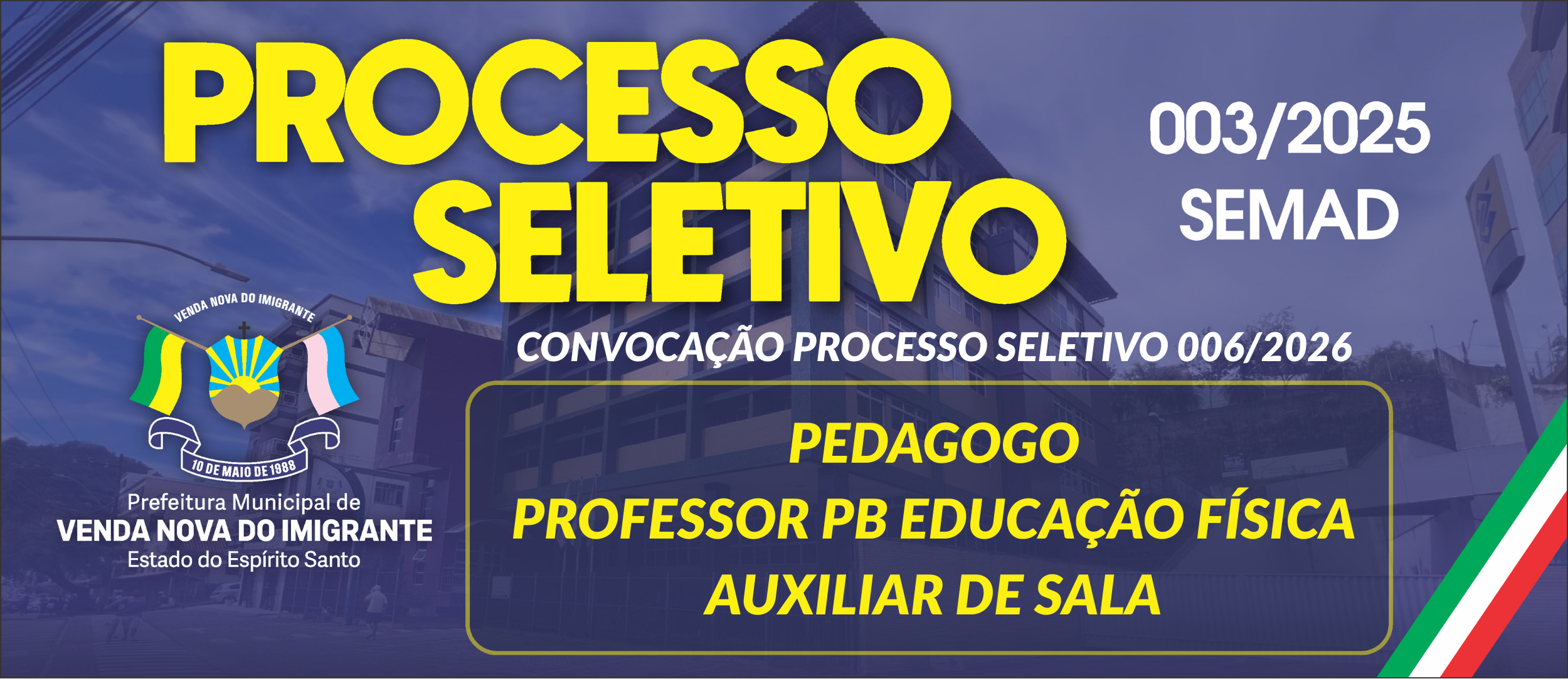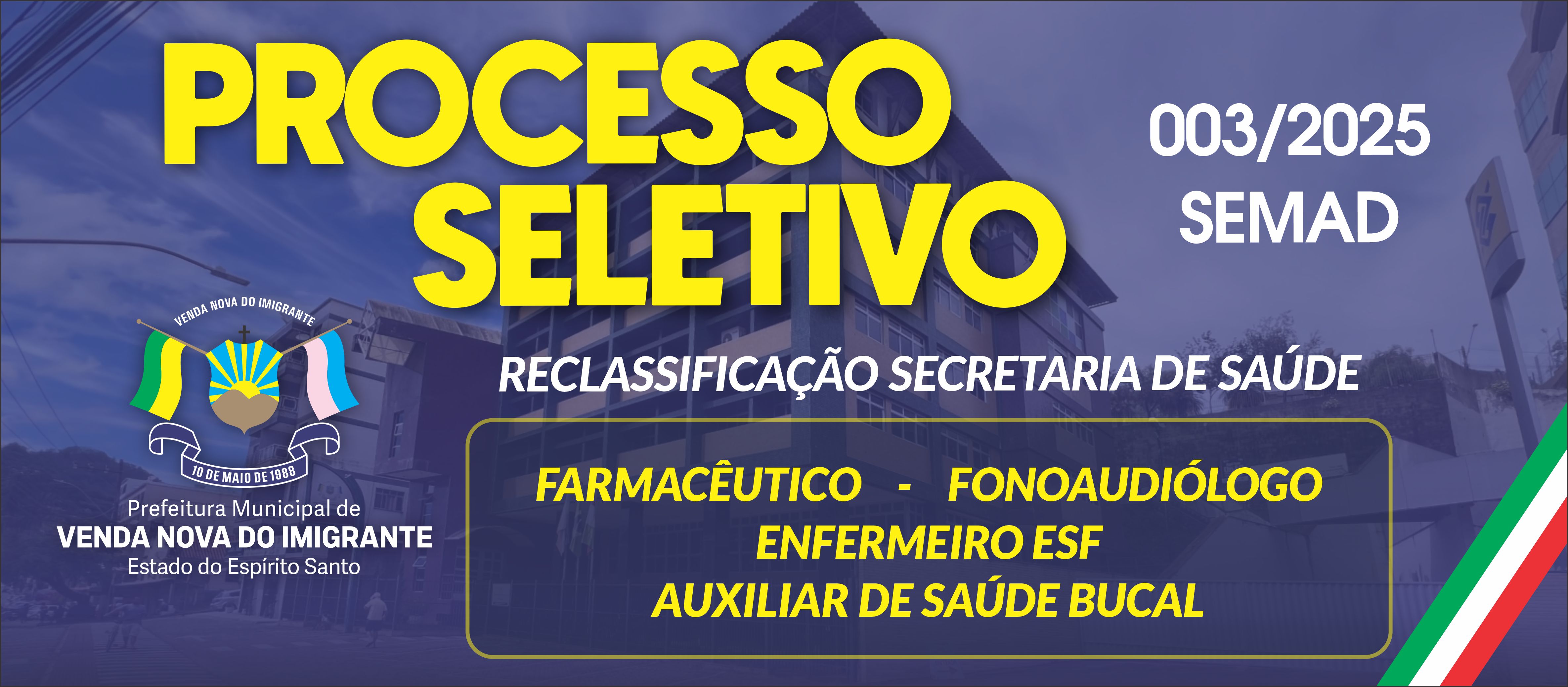 A PREFEITURA MUNICIPAL DE VENDA NOVA DO IMIGRANTE, por intermédio da Secretaria Municipal de Educação, usando de suas atribuições legais para a contratação temporária de PROFISSIONAIS DE EXCEPCIONAL INTERESSE PÚBLICO, considerando o disposto no Edital Processo Seletivo Público SEMAD nº 003/2025, com resultado, devidamente publicado.