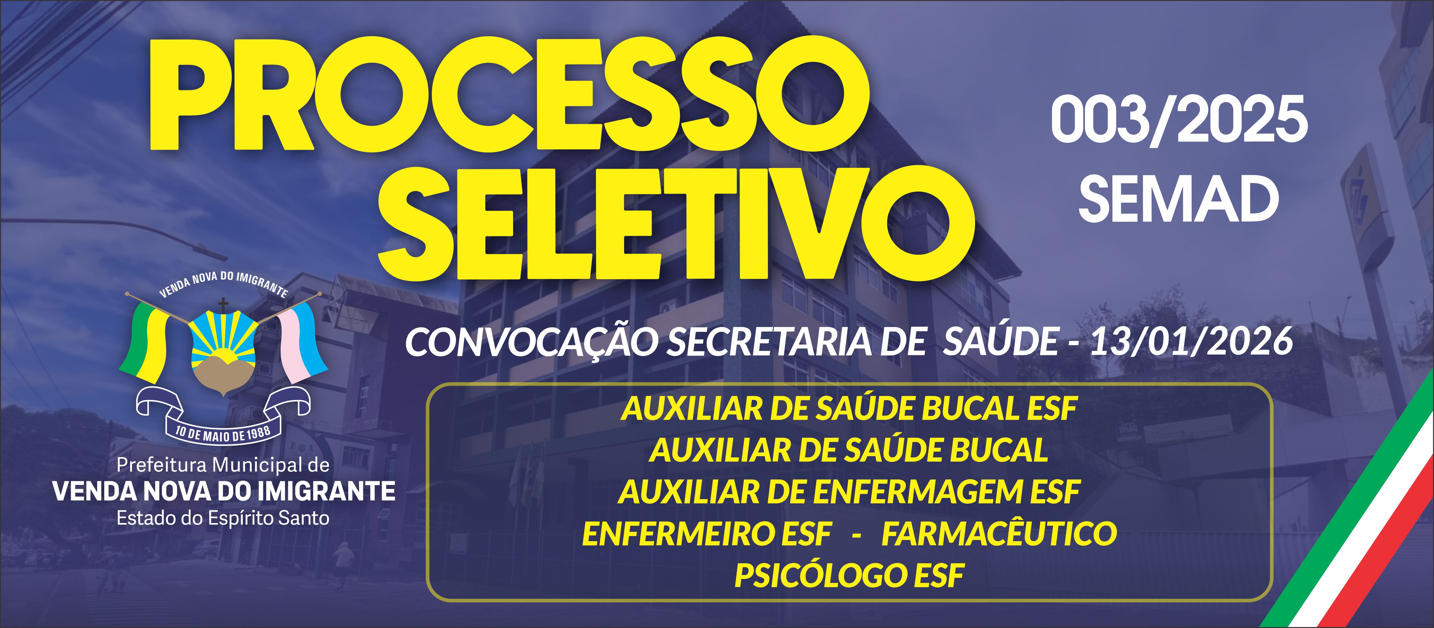 A PREFEITURA MUNICIPAL DE VENDA NOVA DO IMIGRANTE, por intermédio da Secretaria Municipal de Administração, usando de suas atribuições legais para a contratação temporária de PROFISSIONAIS DE EXCEPCIONAL INTERESSE PÚBLICO, considerando o disposto no Edital Processo Seletivo Público SEMAD nº 003/2025, com resultado, devidamente publicado.