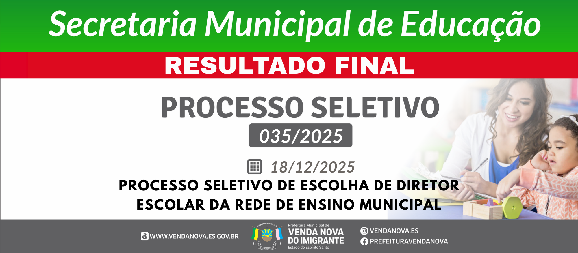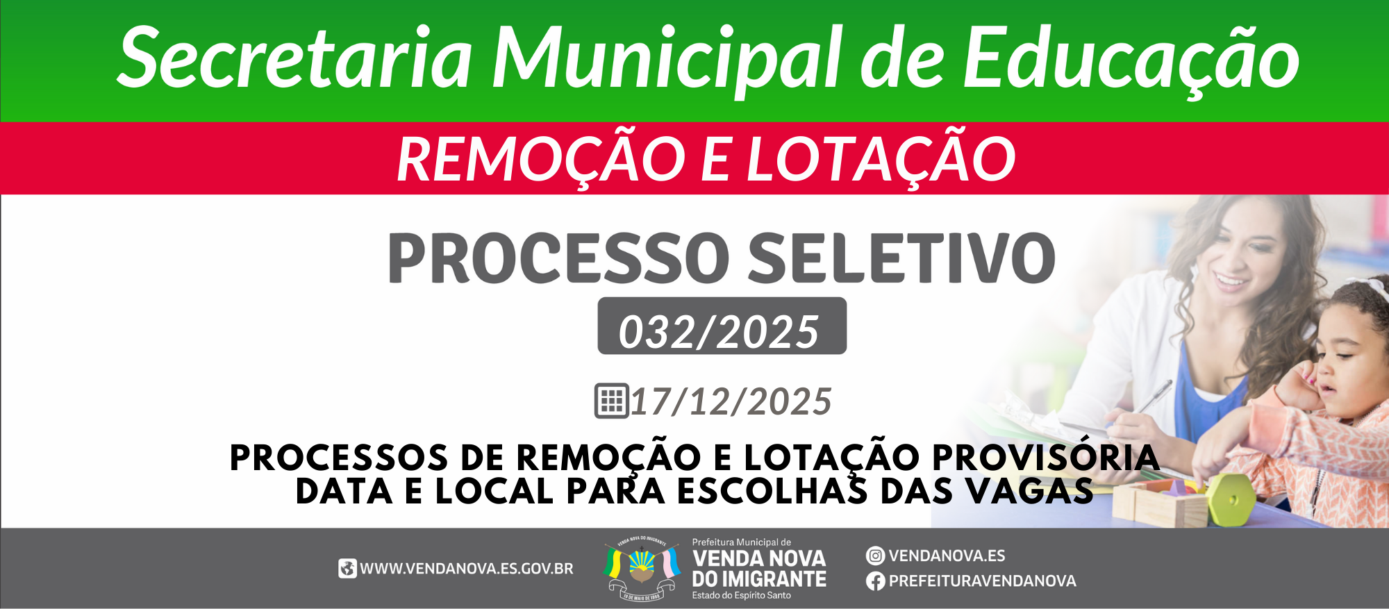 O Secretário Municipal de Educação de Venda Nova do Imigrante – ES, no uso das suas atribuições legais e considerando as decisões proferidas pela Comissão Organizadora deste edital, nomeada pela Portaria Nº 4.162/2025, vem divulgar DATA E LOCAL PARA ESCOLHAS DAS VAGAS DOS PROCESSOS DE REMOÇÃO E LOTAÇÃO PROVISÓRIA.