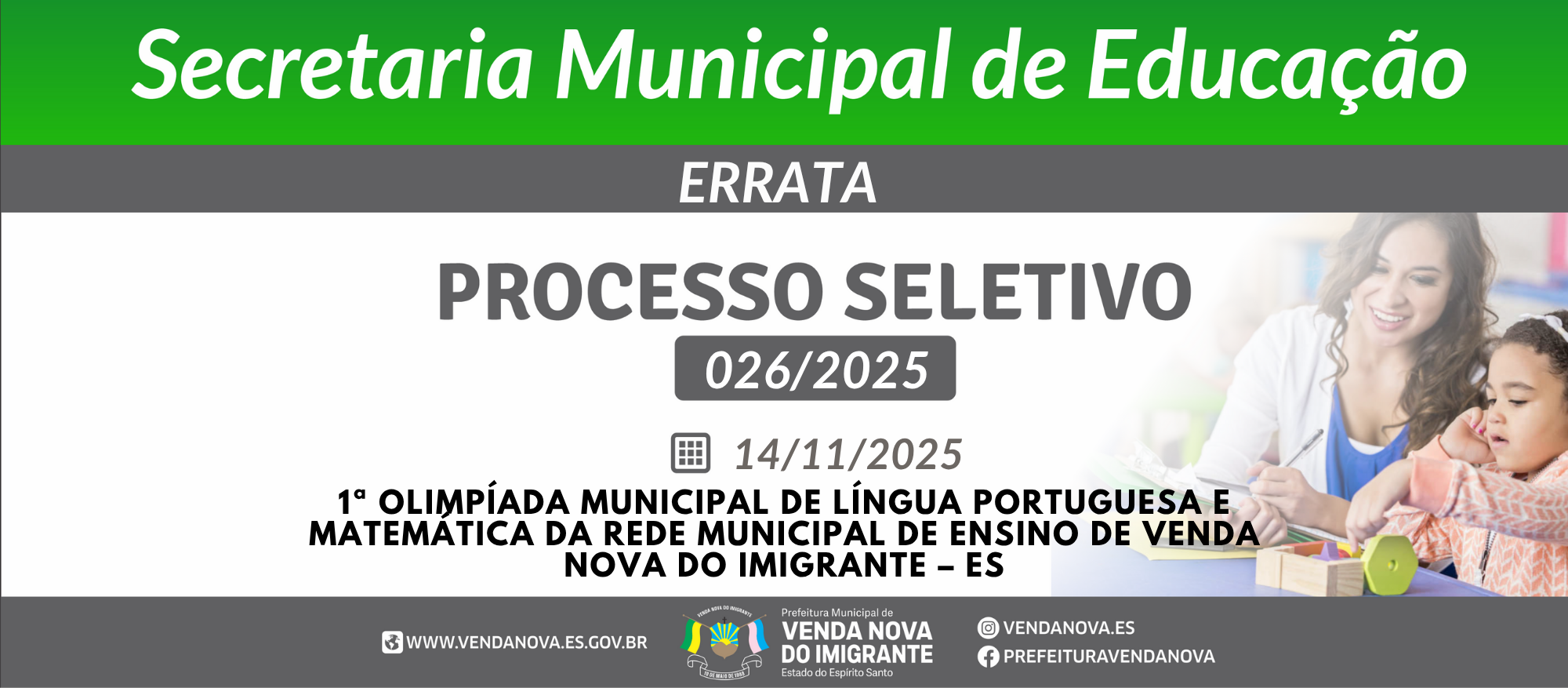A Secretaria Municipal de Educação de Venda Nova do Imigrante, no uso de suas atribuições legais e em conformidade com o Decreto nº 5.191/2025, torna pública a presente ERRATA referente ao Edital nº 026/2025 – 1ª Olimpíada Municipal de Língua Portuguesa e Matemática, para alterar a data de divulgação dos vencedores, conforme segue: