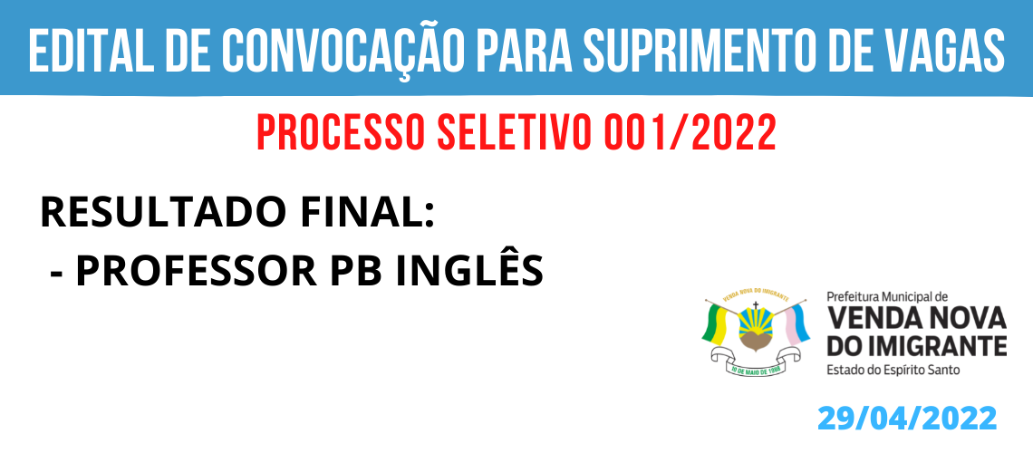 PS 001/2022: RESULTADO FINAL DE CONVOCAÇÃO PARA SUPRIMENTO DE VAGAS - EDUCAÇÃO