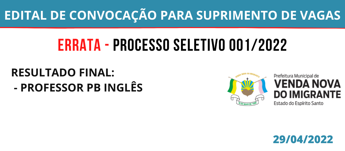 PS 001/2022: RESULTADO FINAL DE CONVOCAÇÃO PARA SUPRIMENTO DE VAGAS / EDUCAÇÃO (ERRATA)