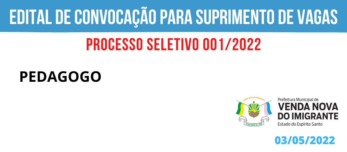 PROCESSO SELETIVO 001/2022: CONVOCAÇÃO PARA SUPRIMENTO DE VAGAS - EDUCAÇÃO