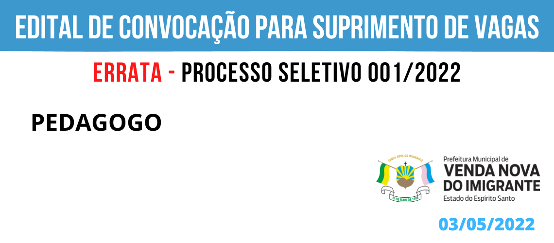 PS 001/2022: CONVOCAÇÃO PARA SUPRIMENTO DE VAGAS / EDUCAÇÃO (ERRATA)